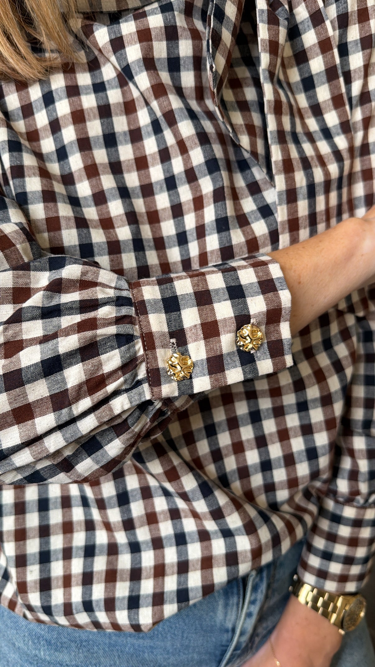 Blouse à carreaux marron, bleu marine et écru. Col lavallière.