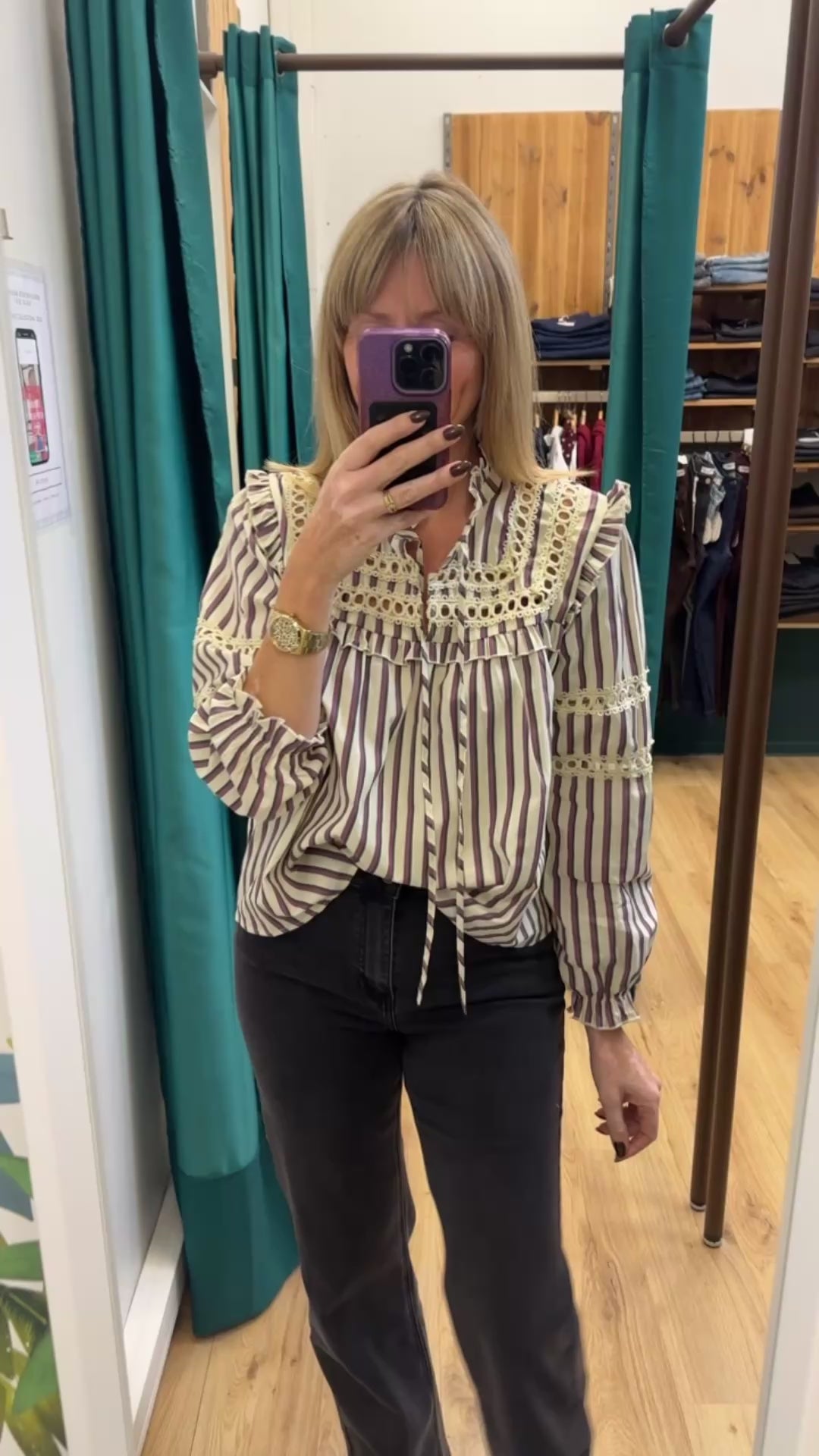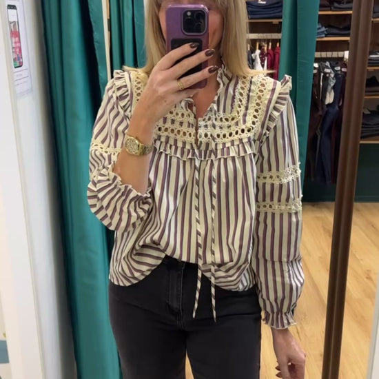 Blouse rayée écru, aubergine et gris, avec détail dentelle. Col victorien et lien à nouer.