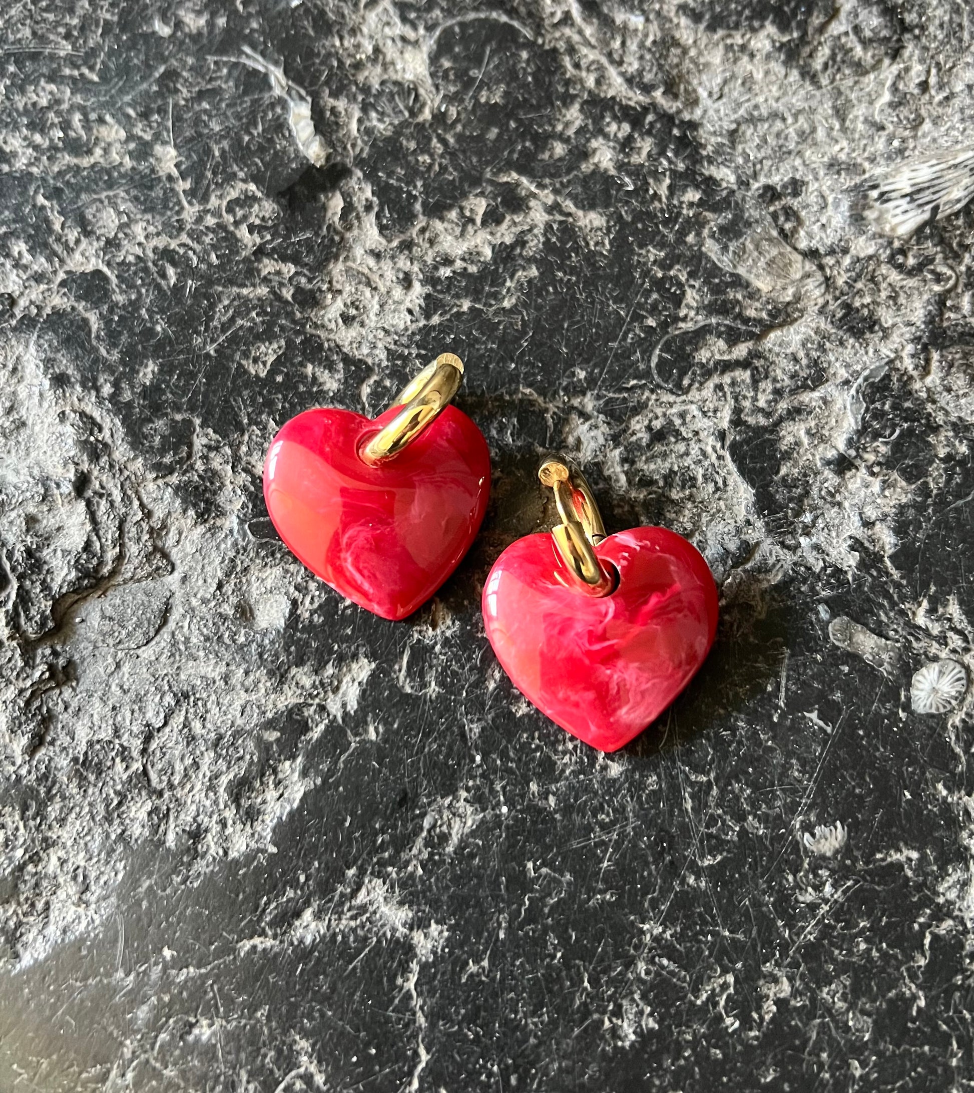 Boucles d’oreilles rouge en résine en forme de cœur.