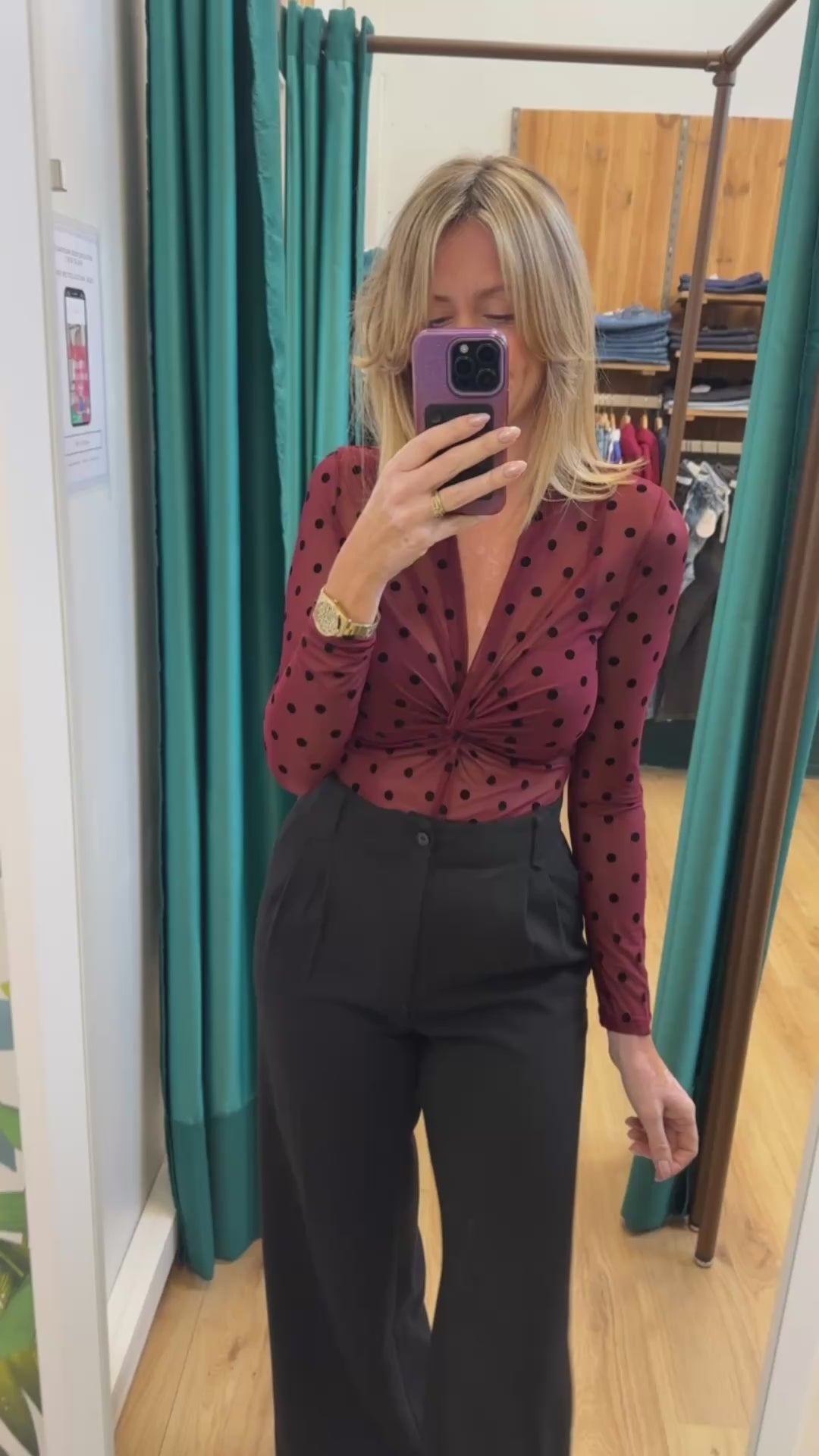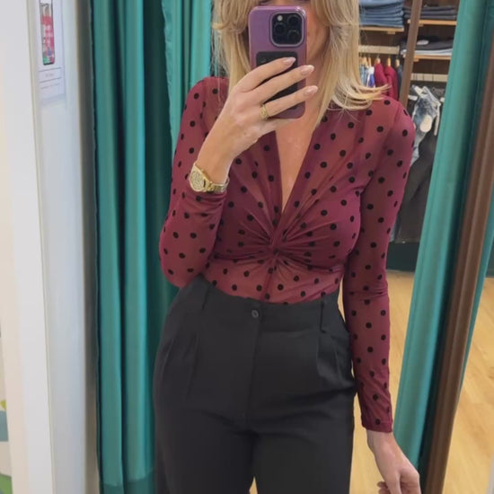 Body manches longues à pois noirs avec une transparence, décolleté plongeant avec un détail noeud au milieu de la poitrine. La matière est élastique, très agréable à porter.