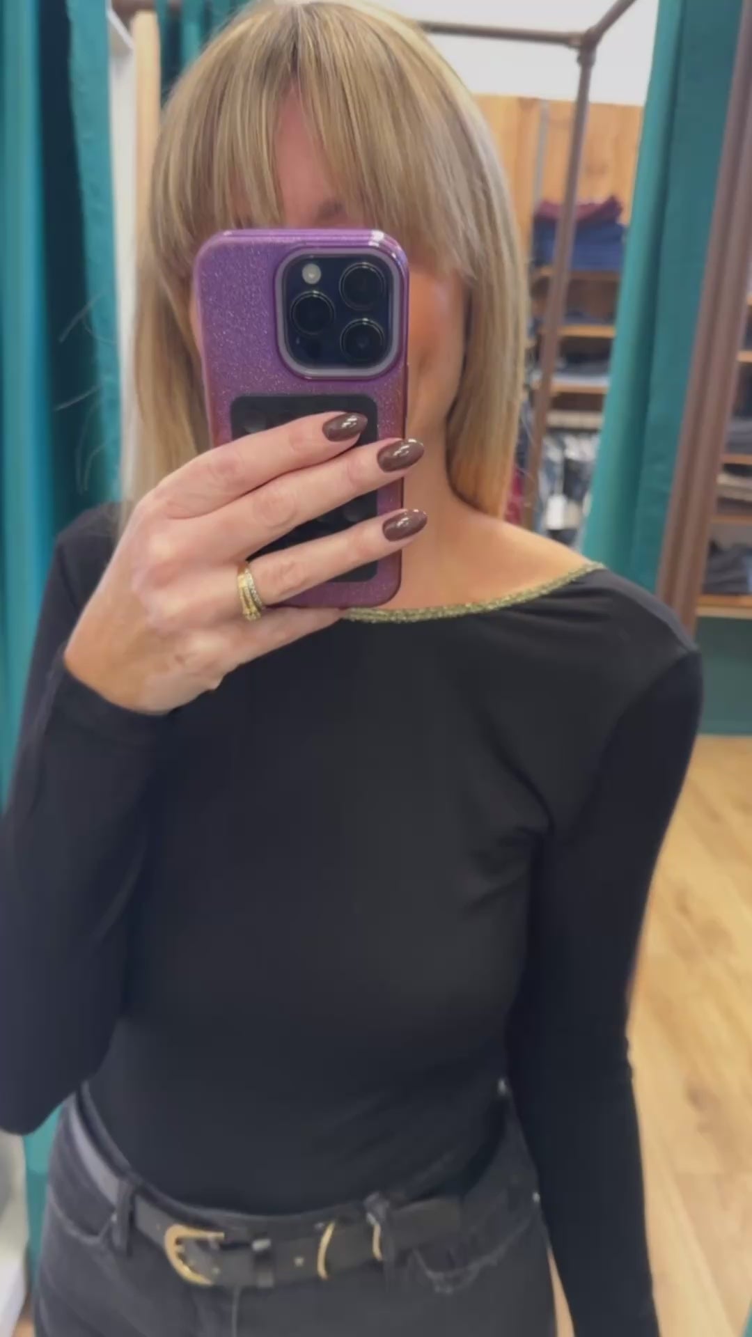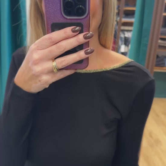 Body noir à longues manches avec le bord doré. Décolleté dans le dos. La matière est extrêmement douce. La culotte est en forme de tanga, avec des pressions pour le fermer.