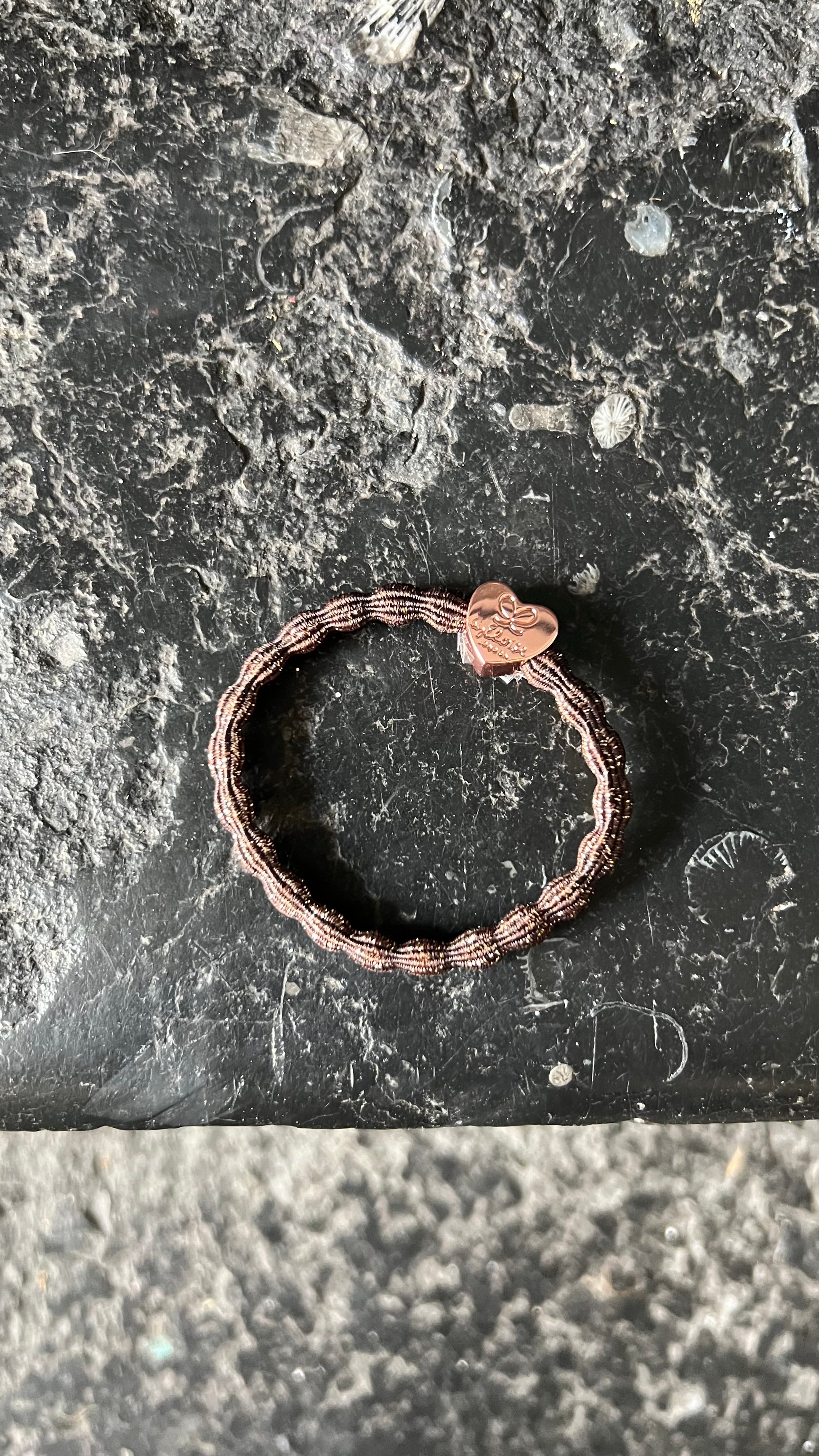 Charms coeur en or rose sur bandeau élastiqué en fil métallique.