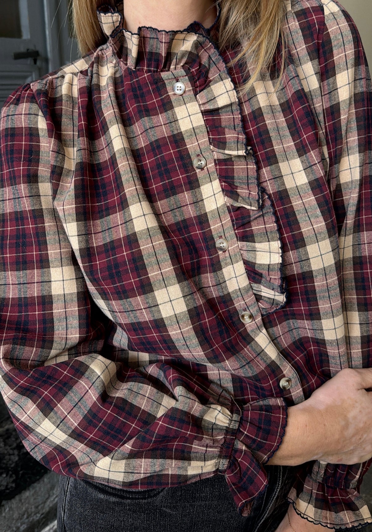 Chemise tartan bordeaux, beige et bleu marine. Volants au niveau du col, de la boutonnière et des manches.