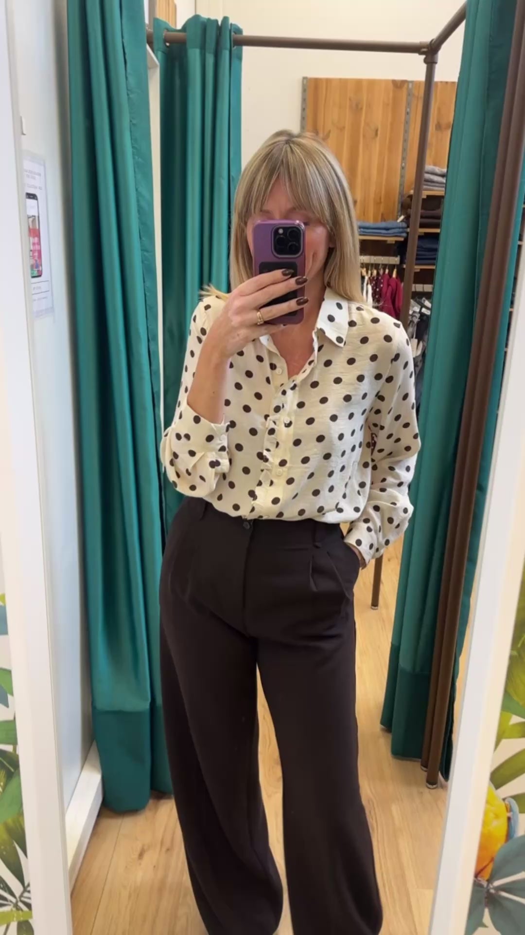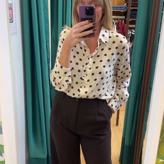 Chemise fluide écru avec des pois chocolat. Détail petit volant de long de la boutonnière.