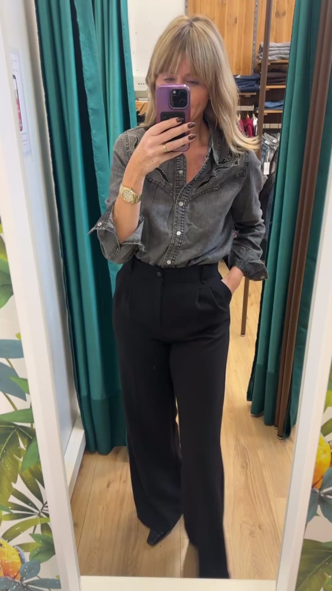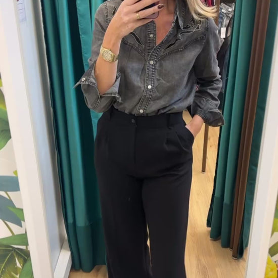 Chemise en jean gris délavé, avec détail broderie noire. Boutons pression.