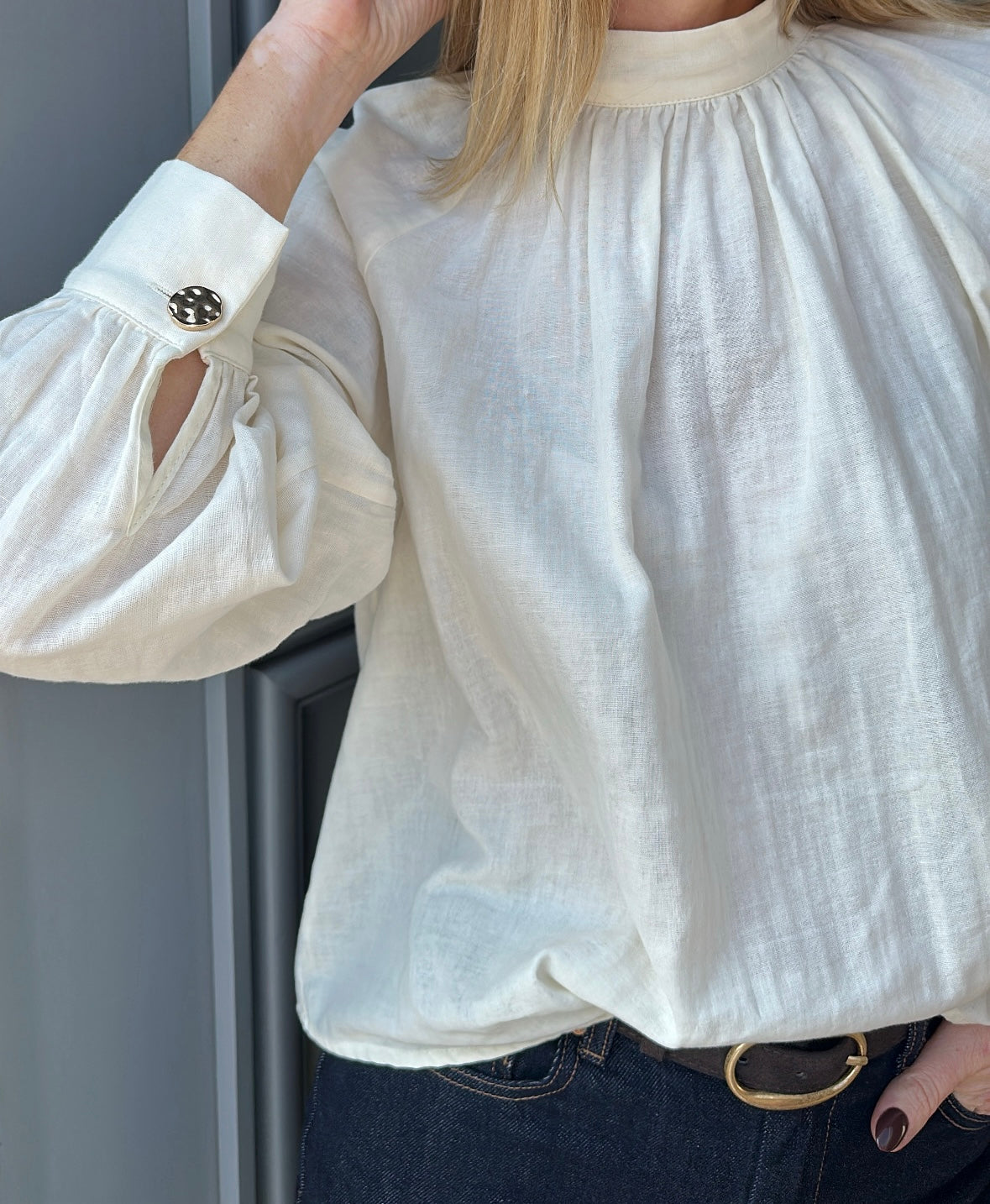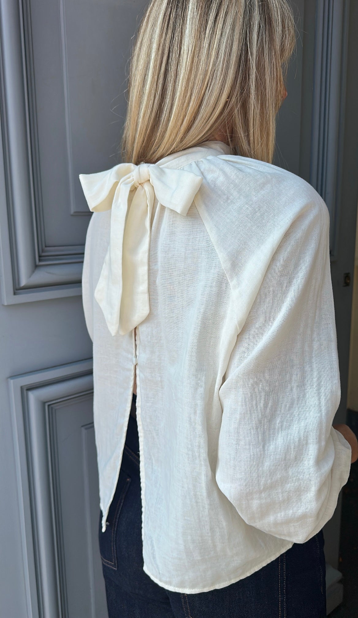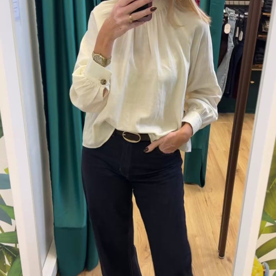 Chemisier col montant avec détail noeud dans le dos à nouer. Petits boutons à l’arrière pour le fermer. Détail bouton doré sur les poignets. Le tissus est très fluide.
