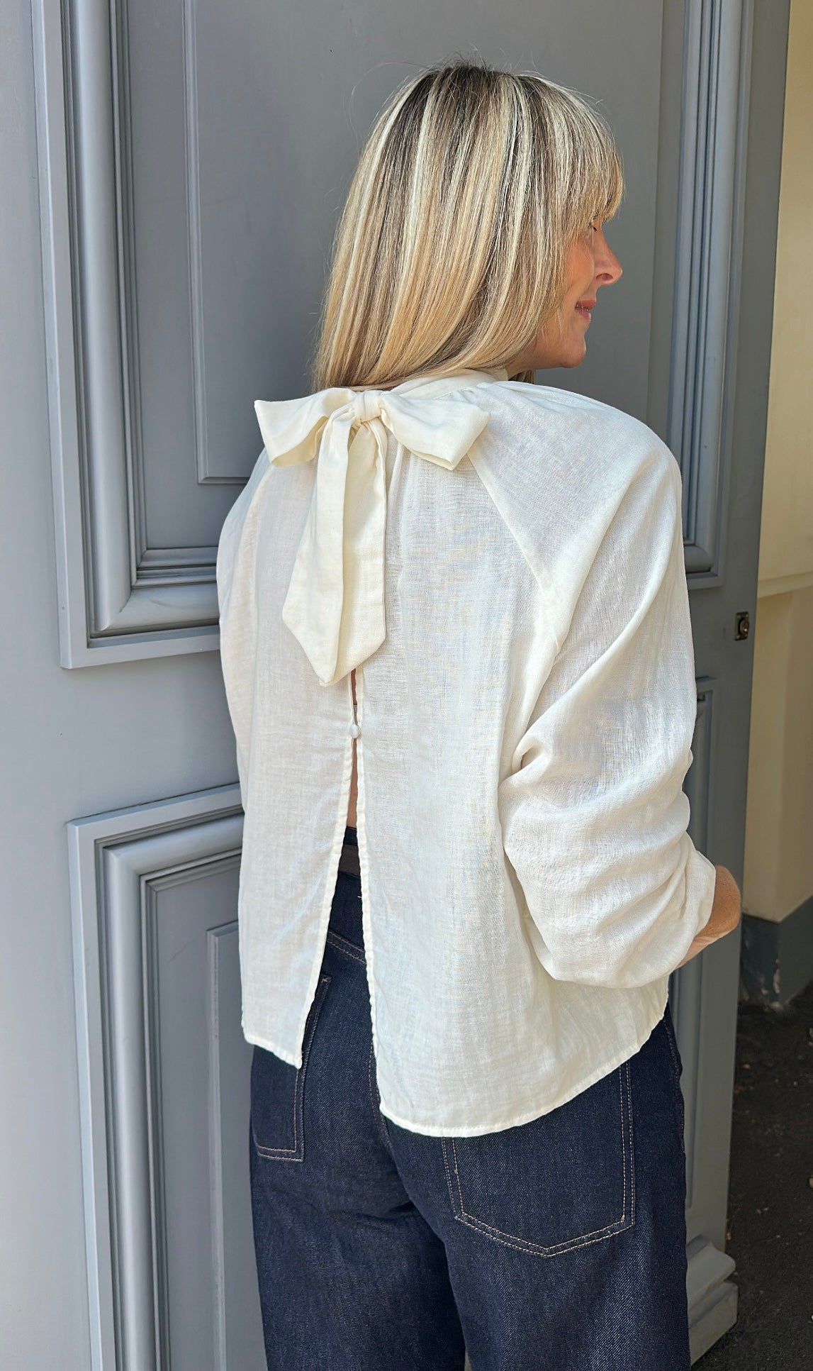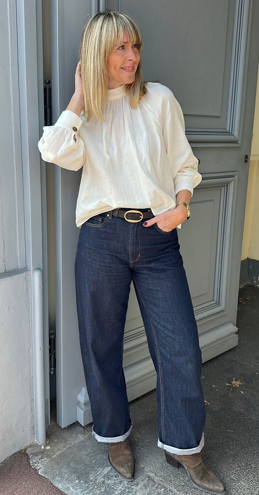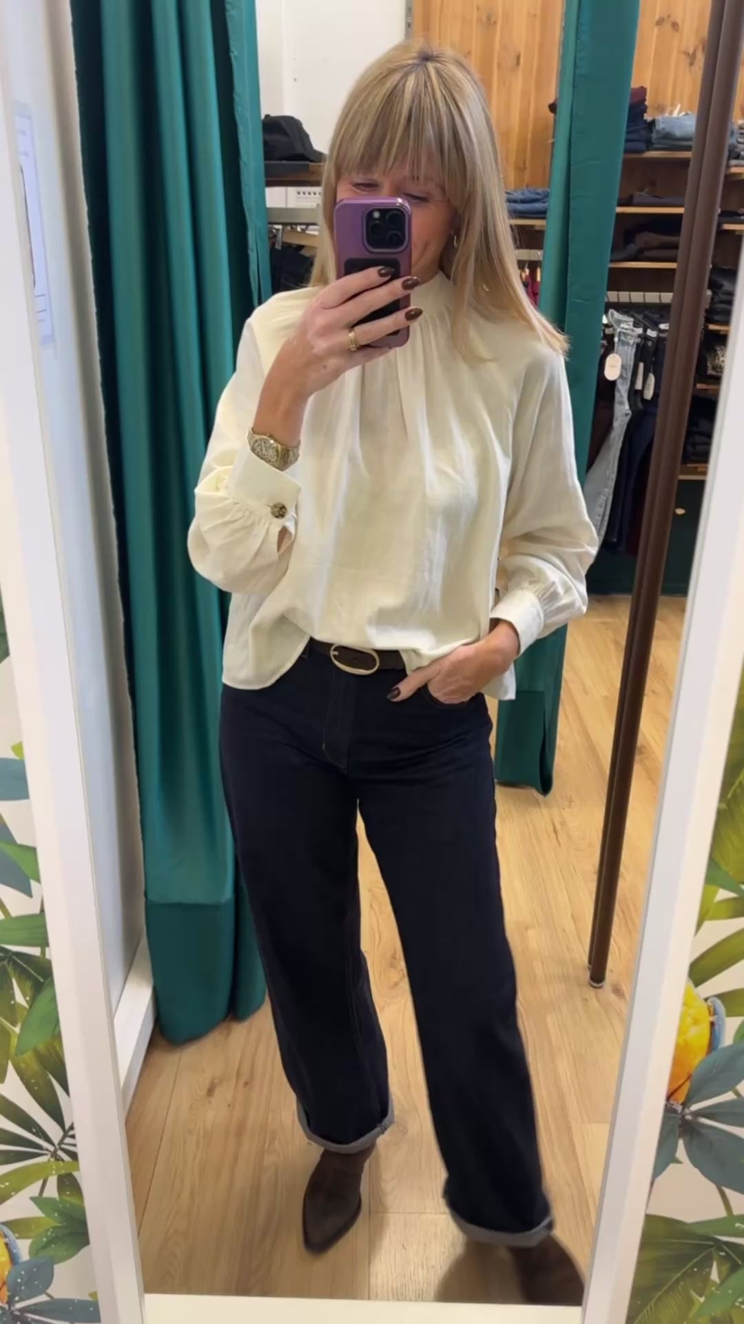 Chemisier col montant avec détail noeud dans le dos à nouer. Petits boutons à l’arrière pour le fermer. Détail bouton doré sur les poignets. Le tissus est très fluide.