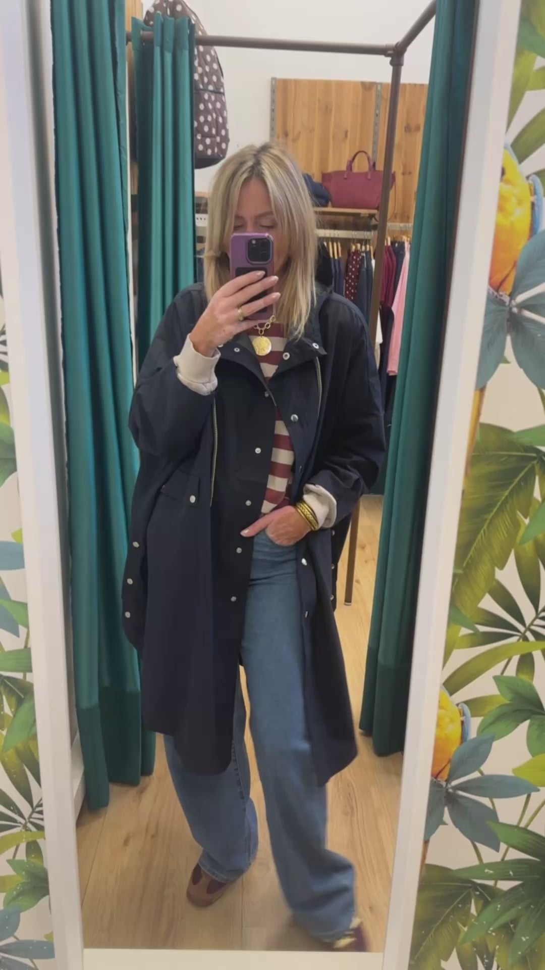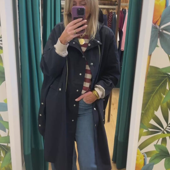 Imperméable bleu marine oversize, non doublé avec deux poches sur le devant. Grande capuche.
