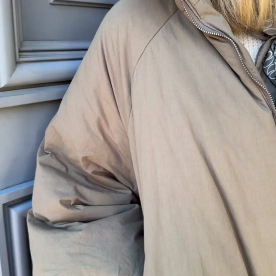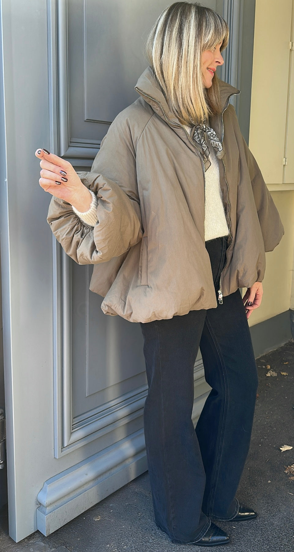 Doudoune oversize avec détail bouffant dans le bas et sur les manches. Sa coupe est ultra originale et très confort. Les manches sont bouffantes et en longueur 3/4.