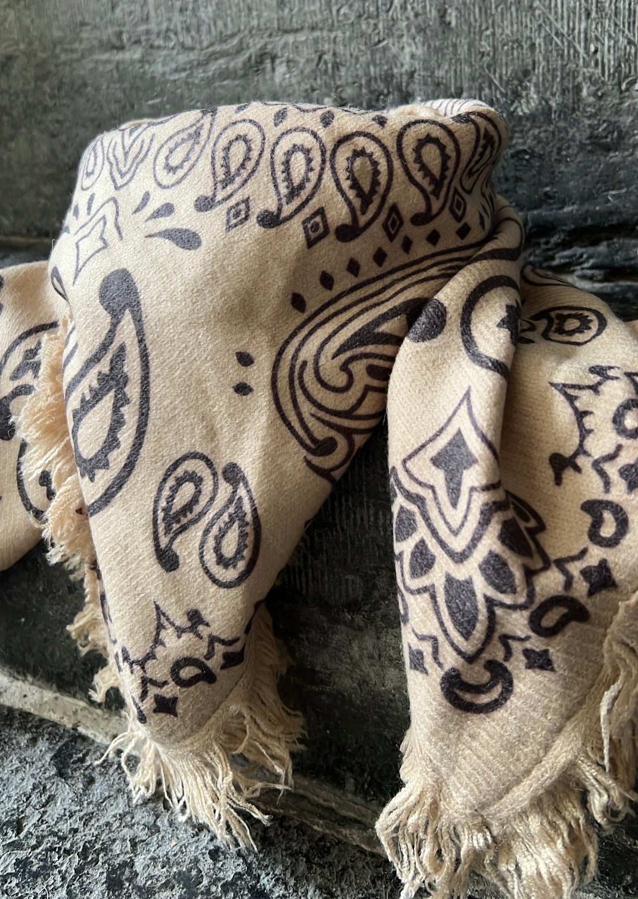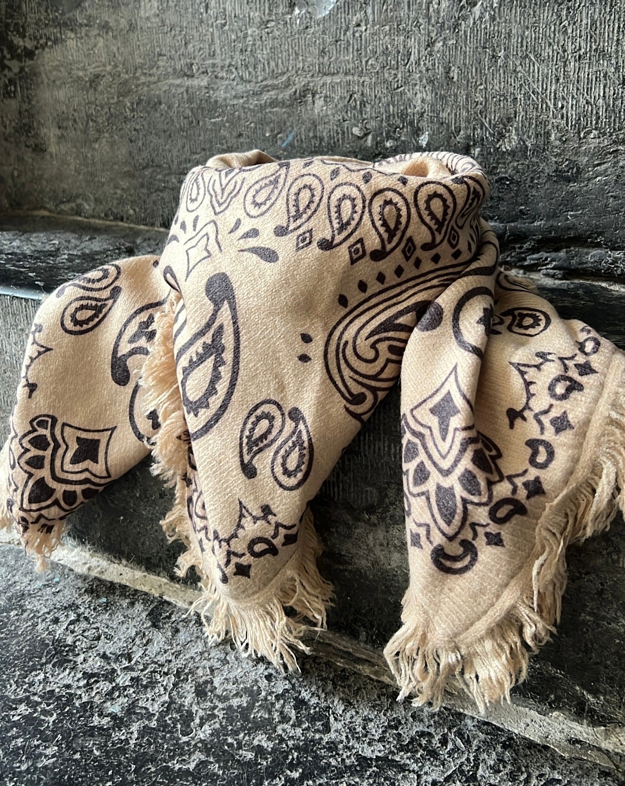 Écharpe carrée toute douce imprimé bandana, avec détail petites franges sur les côtés .