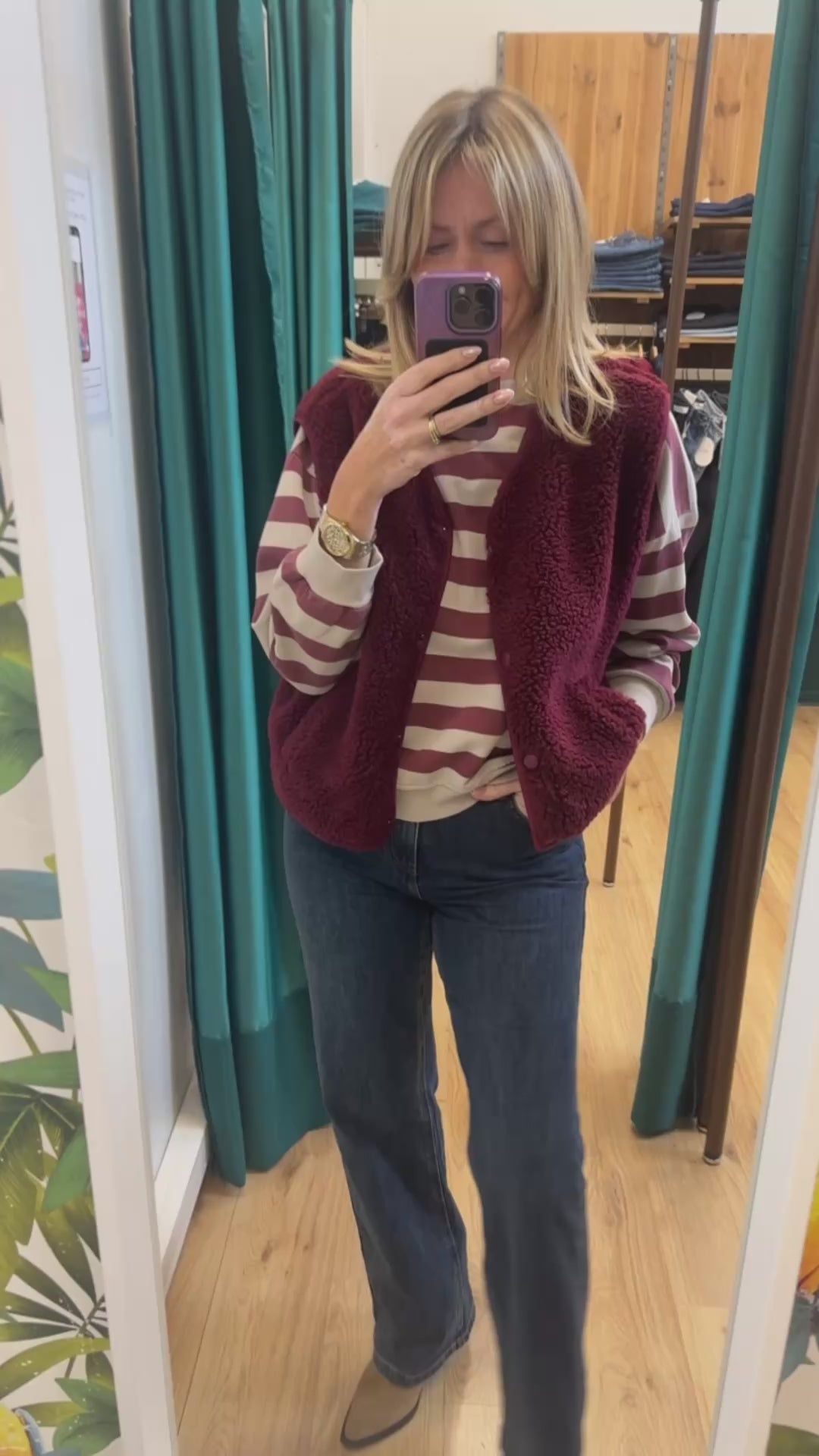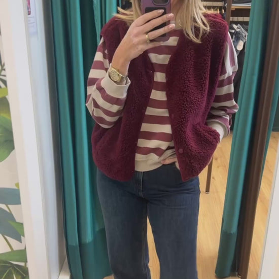 Gilet sans manches en moumoute, coupe oversize. Poches de chaque côté, boutons pression.