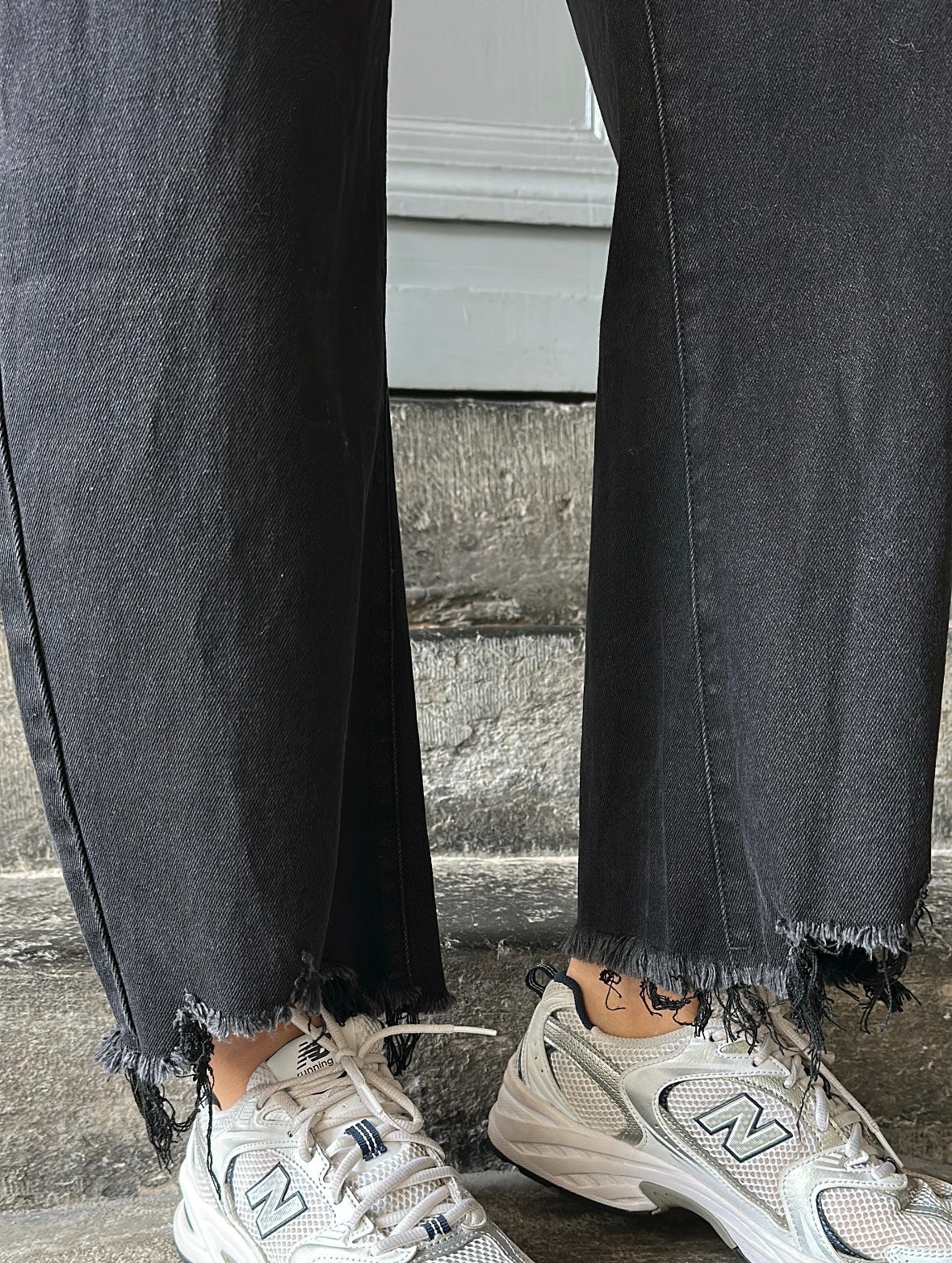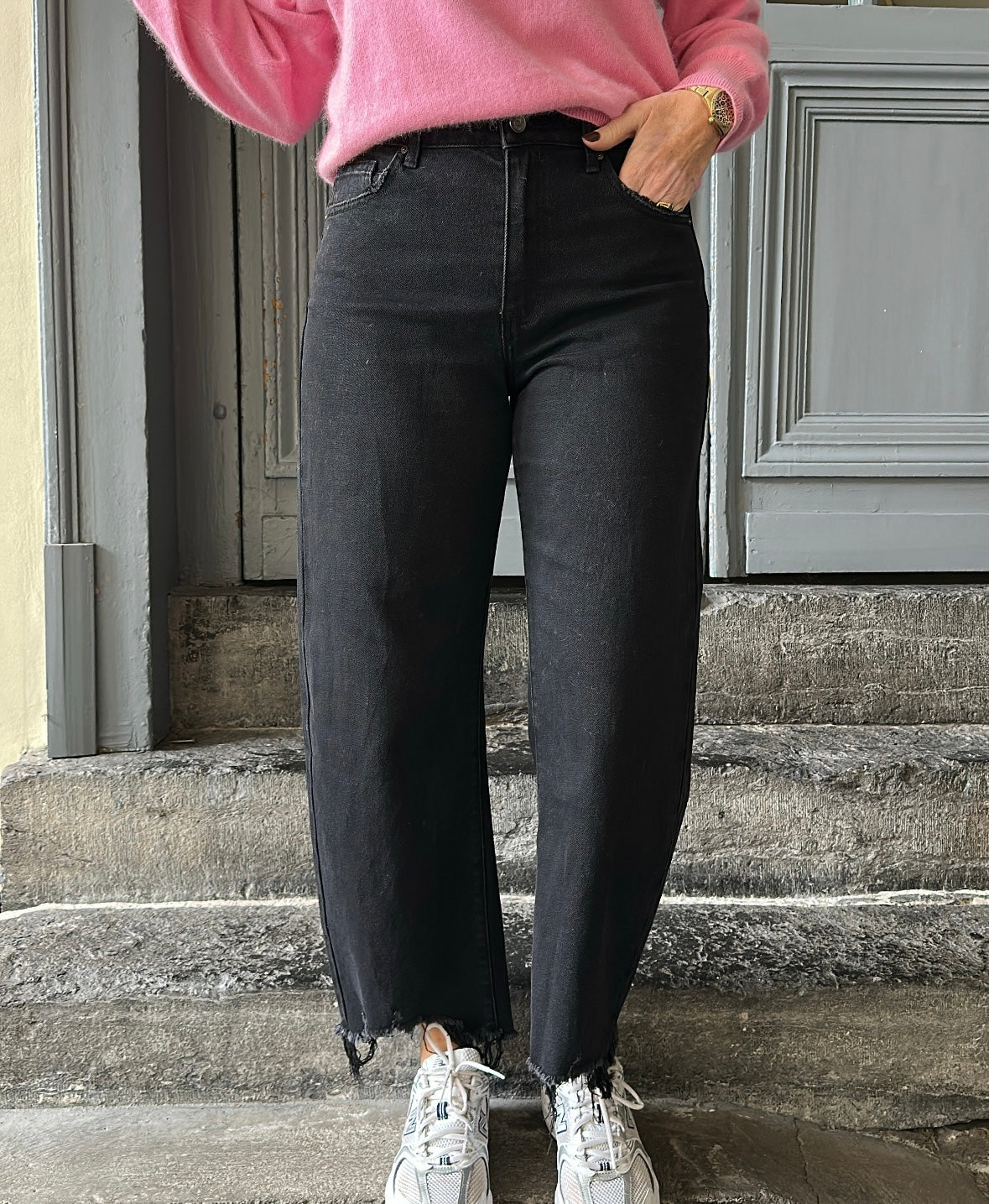 Jean coupe ballon avec détail bas effiloché. Taille haute.