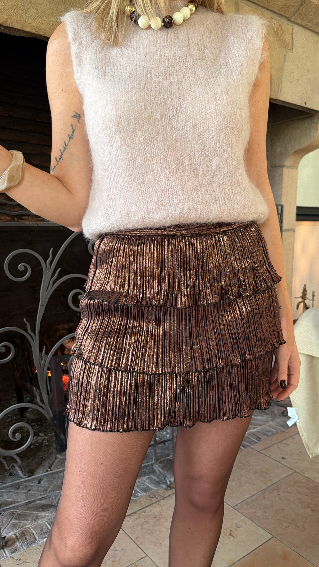 Jupe courte à volants plissés marron cuivré. Taille haute. Sa coupe est ajustée. Doublure short.
