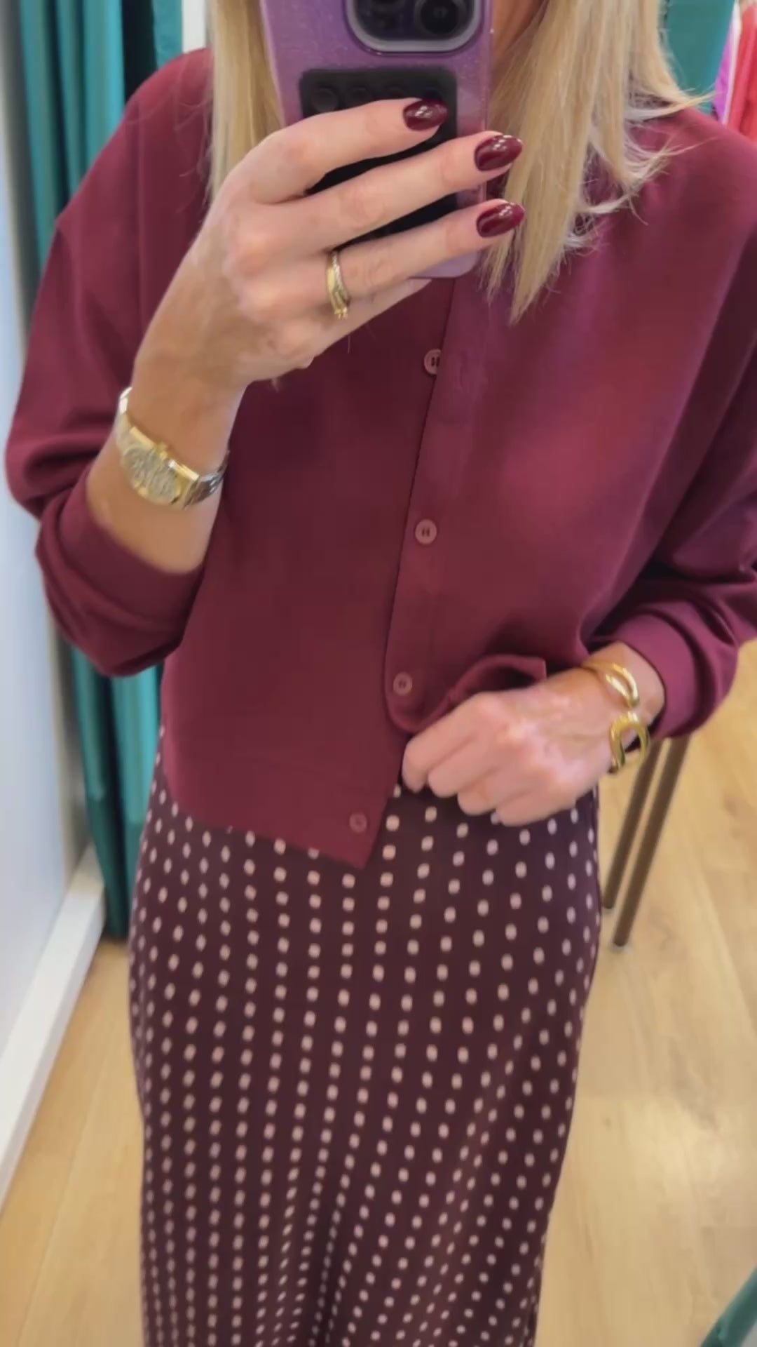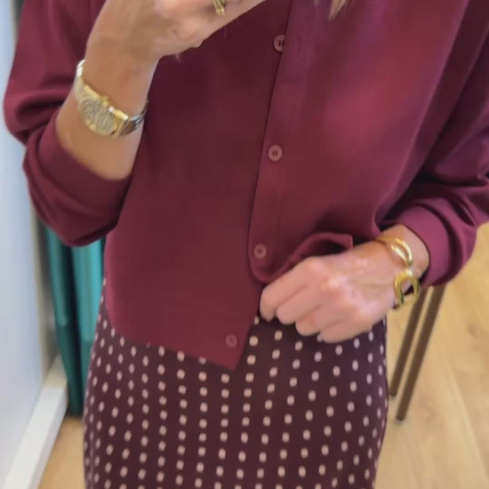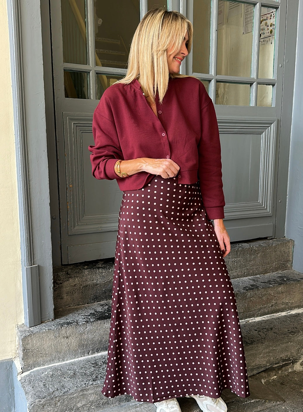 Jupe satinée bordeaux à pois rose pâle. La taille est élastiquée.