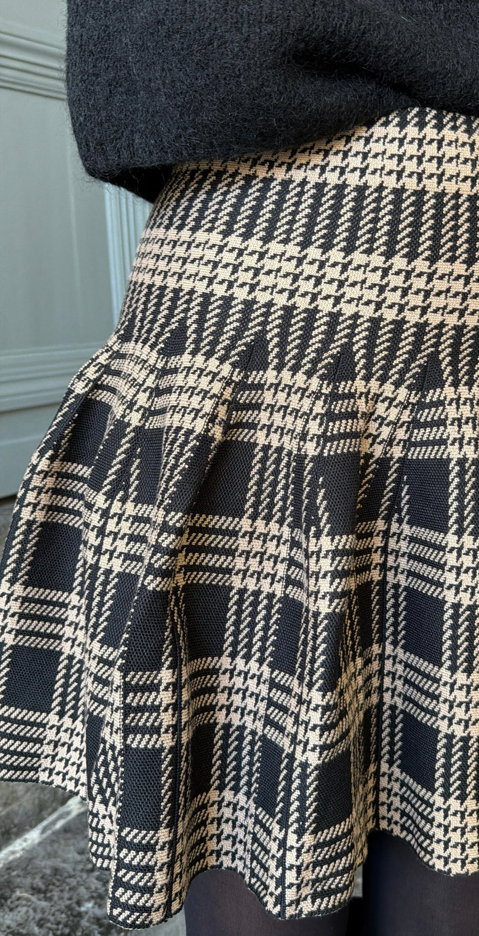 Jupe en maille plissée taille haute, à carreaux taupe et noir. Taille marquée.