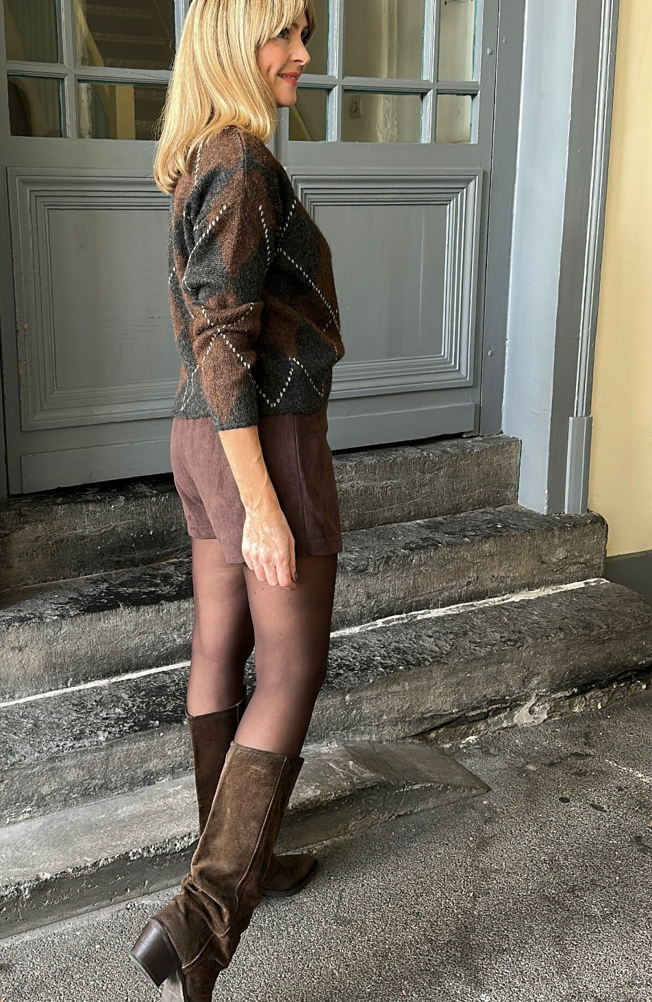 Jupe/short en suédine marron. Coupe ajustée, taille haute. La matière est très confortable.