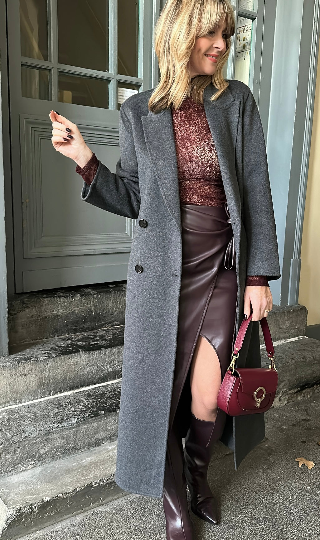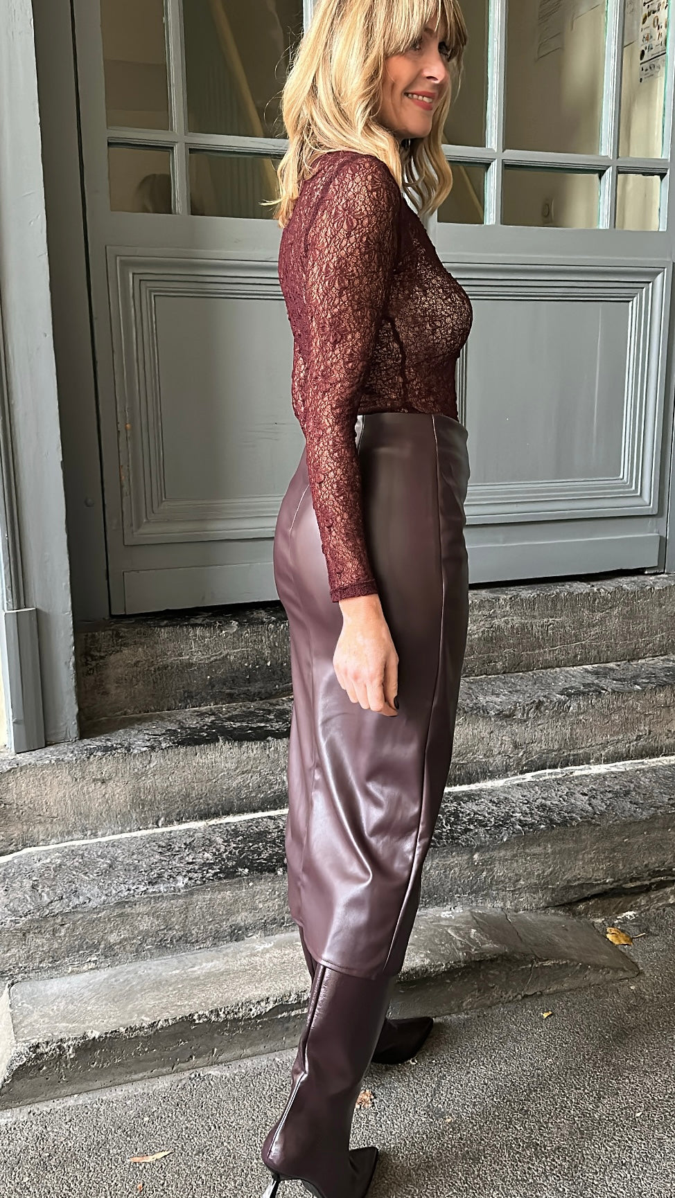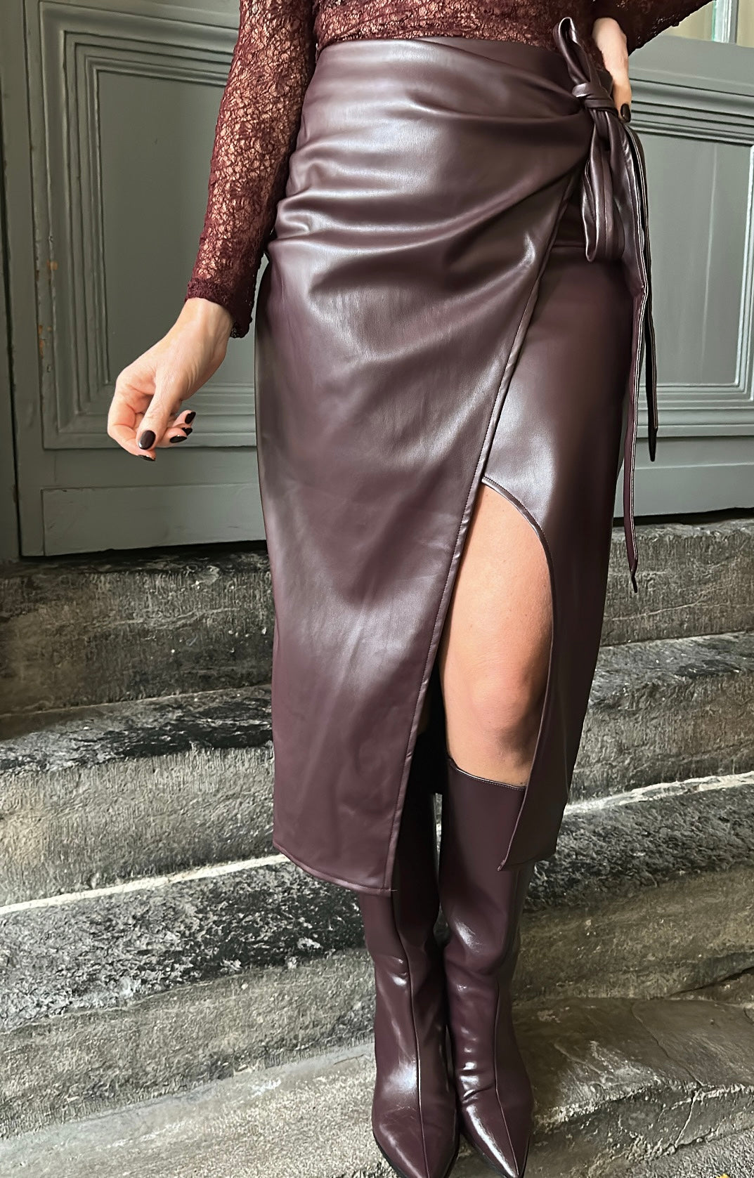 Jupe portefeuille en simili souple burgundy. Ceinture intégrée à nouer à la taille. Fente sur le devant. Fermeture derrière discrète.