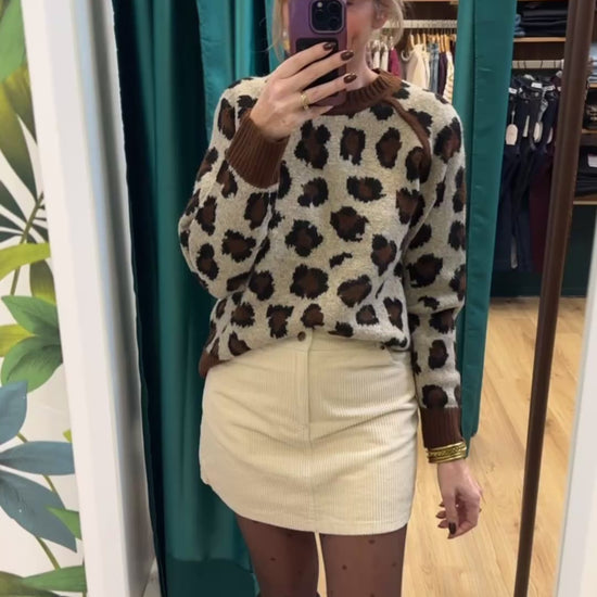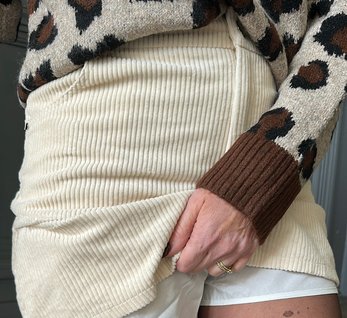 Jupe courte en velours chocolat avec deux poches à l’avant et à l’arrière.