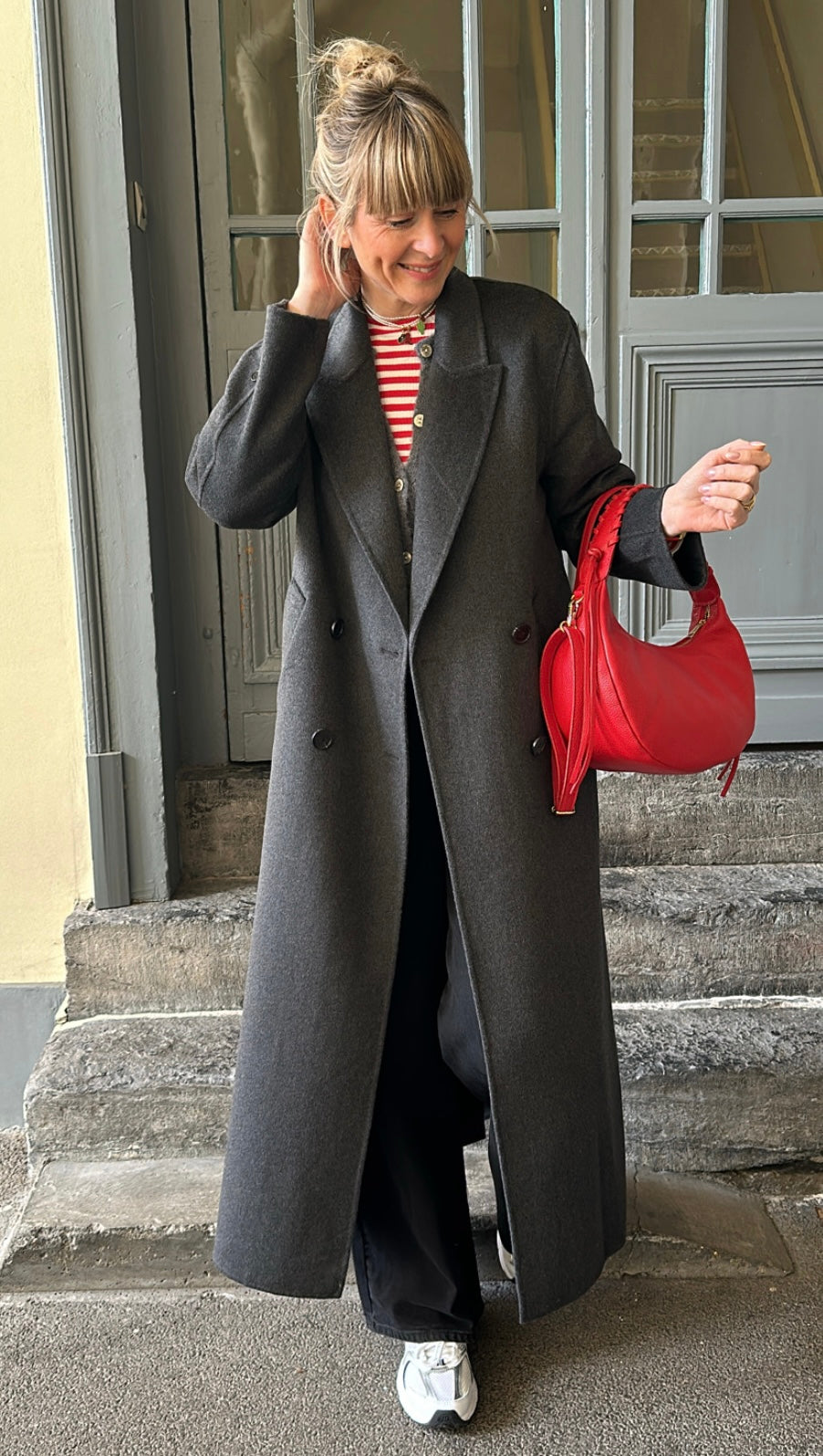 Manteau coupe droite gris anthracite en laine. Maxi longueur. Ce manteau est idéal pour la mi saison. Détail boutons croisés, fente dans le bas du dos. Poches de chaque côté. La matière est très agréable à porter et légère.