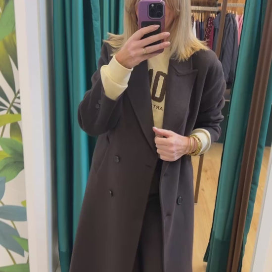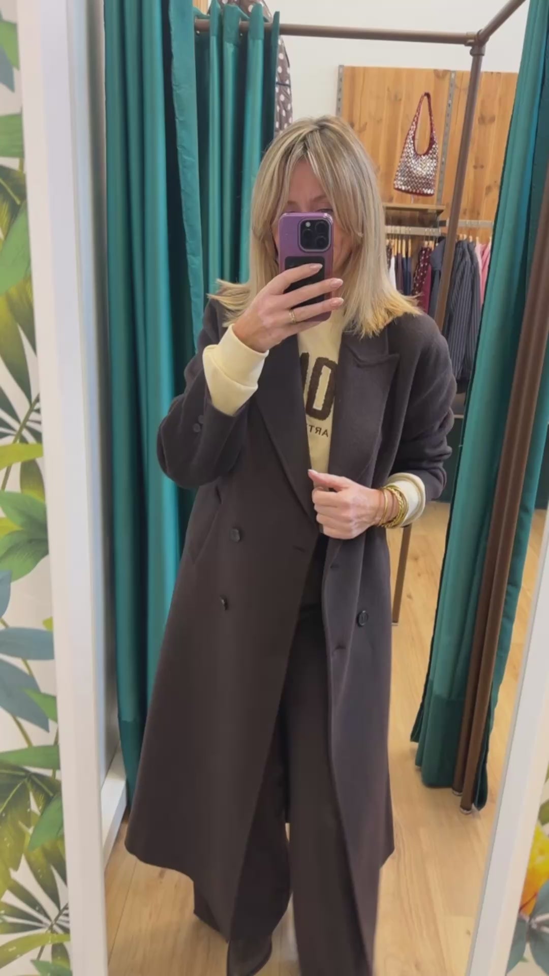 Manteau coupe droite chocolat en laine. Maxi longueur. Ce manteau est idéal pour la mi saison. Détail boutons croisés, fente dans le bas du dos. Poches de chaque côté. La matière est très agréable à porter et légère.