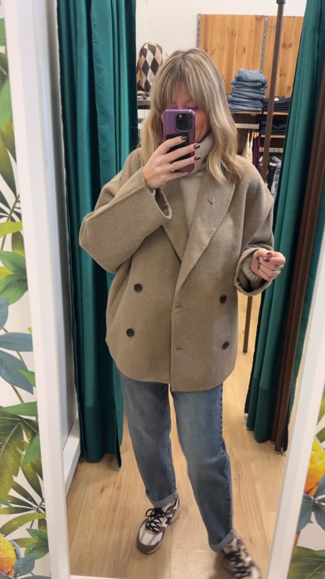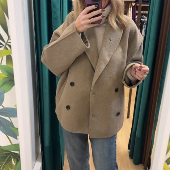 Manteau coupe oversize taupe. Détail boutons croisés, poches de chaque côté. Col châle. La matière est très agréable à porter et légère.
