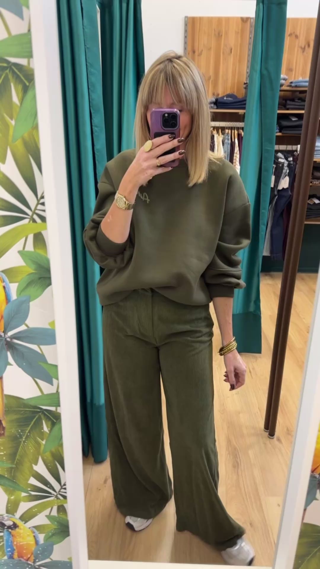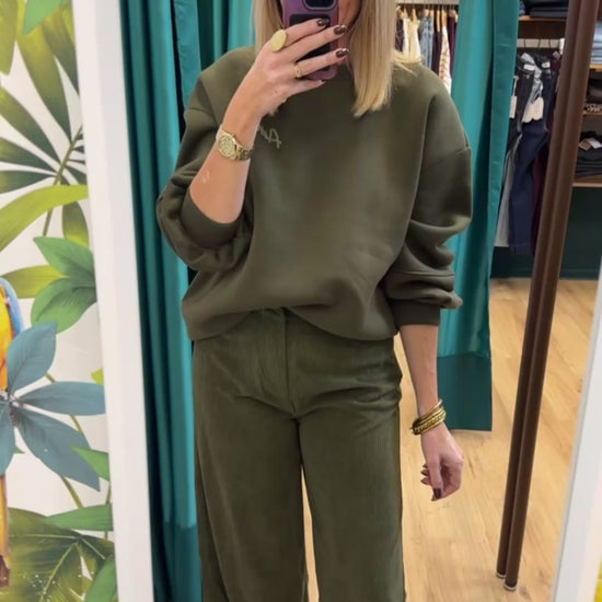 Pantalon en velours léger kaki, taille mi haute, coupe droite.