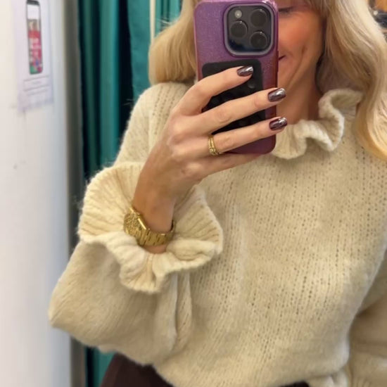 Pull oversize détail col et manches à volant, un mélange de douceur, 38% acrylique, 32% polyamide, 18% de laine, 12% de kid mohair.