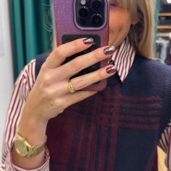 Pull sans manches tout doux, à carreaux bleu marine et bordeaux. Col rond.