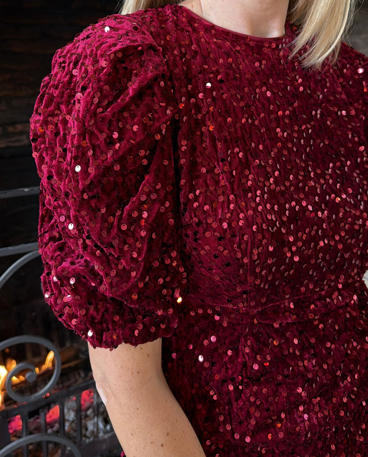 Robe courte à manches bouffantes en velours extensible entièrement brodé de sequins. Encolure ronde et ouverture dos avec découpe ovale fermée par agrafe. Fermeture zippée dissimulée au dos.