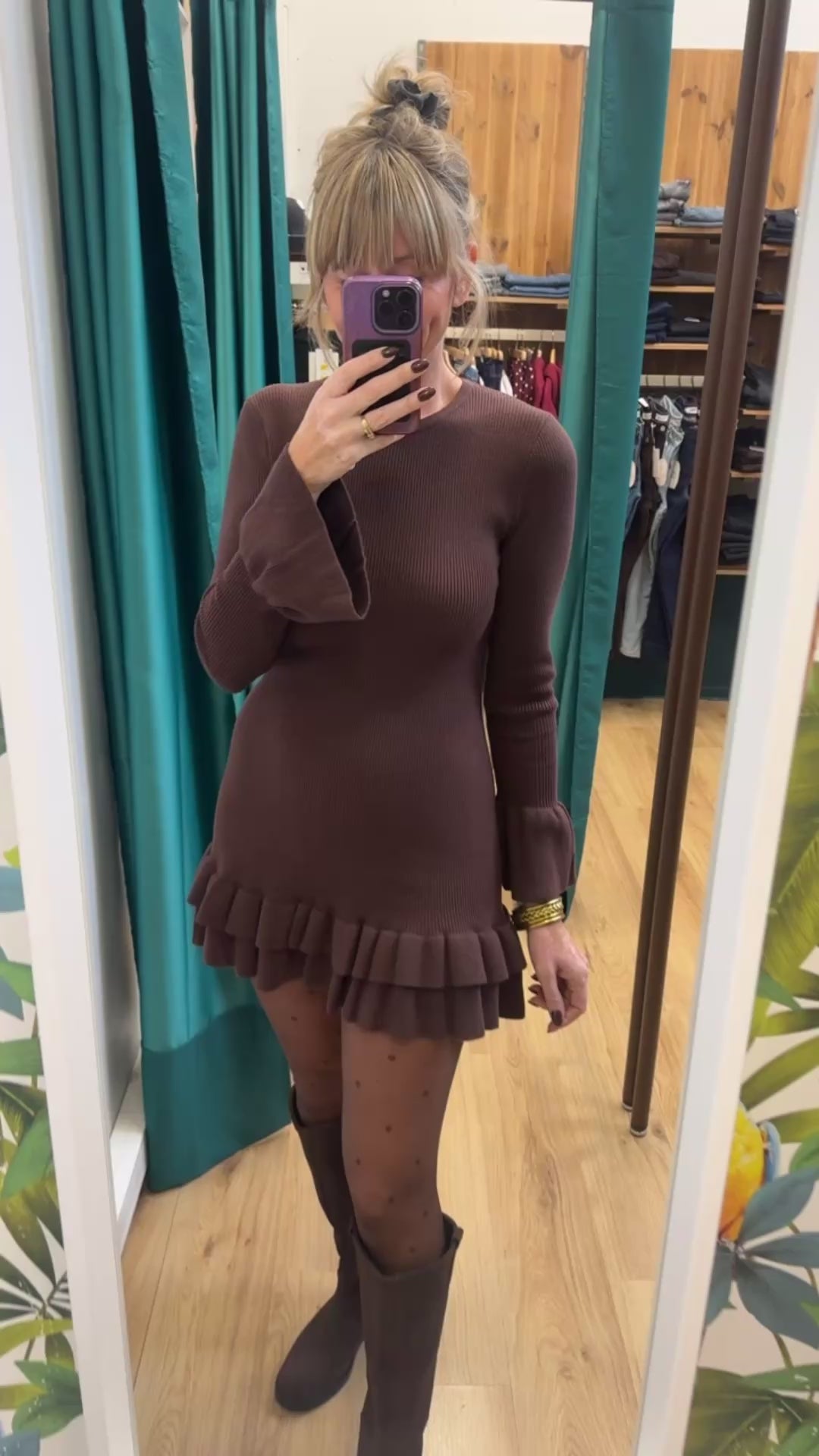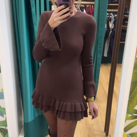 Robe en maille moulante, avec détail volants aux poignets et dans le bas.