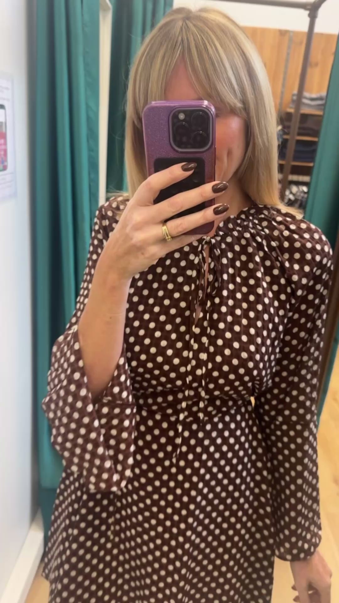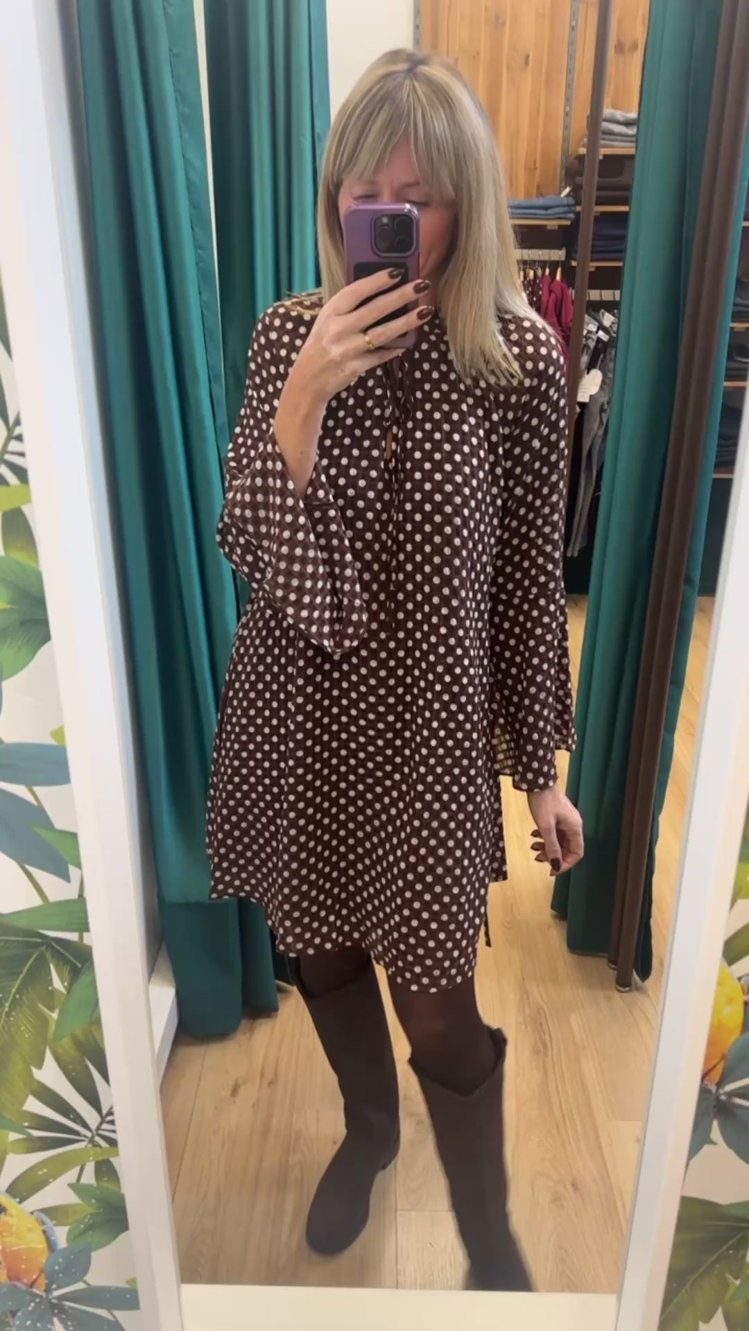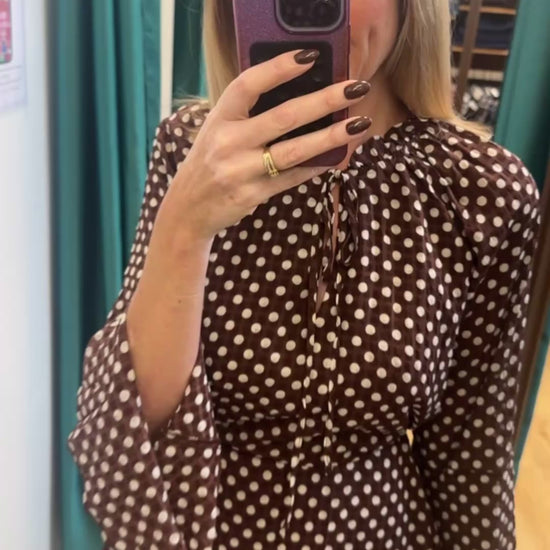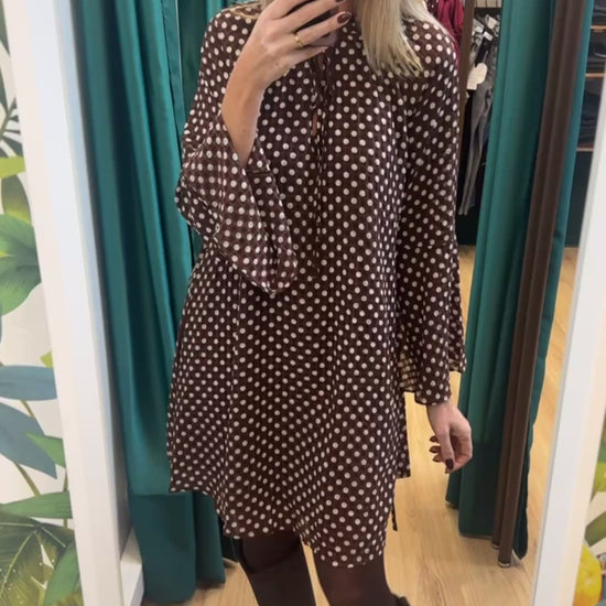 Robe chocolat avec des pois écru. La matière est très fluide. Détail manches évasées. La robe est doublée. Lien pour marquer la taille.