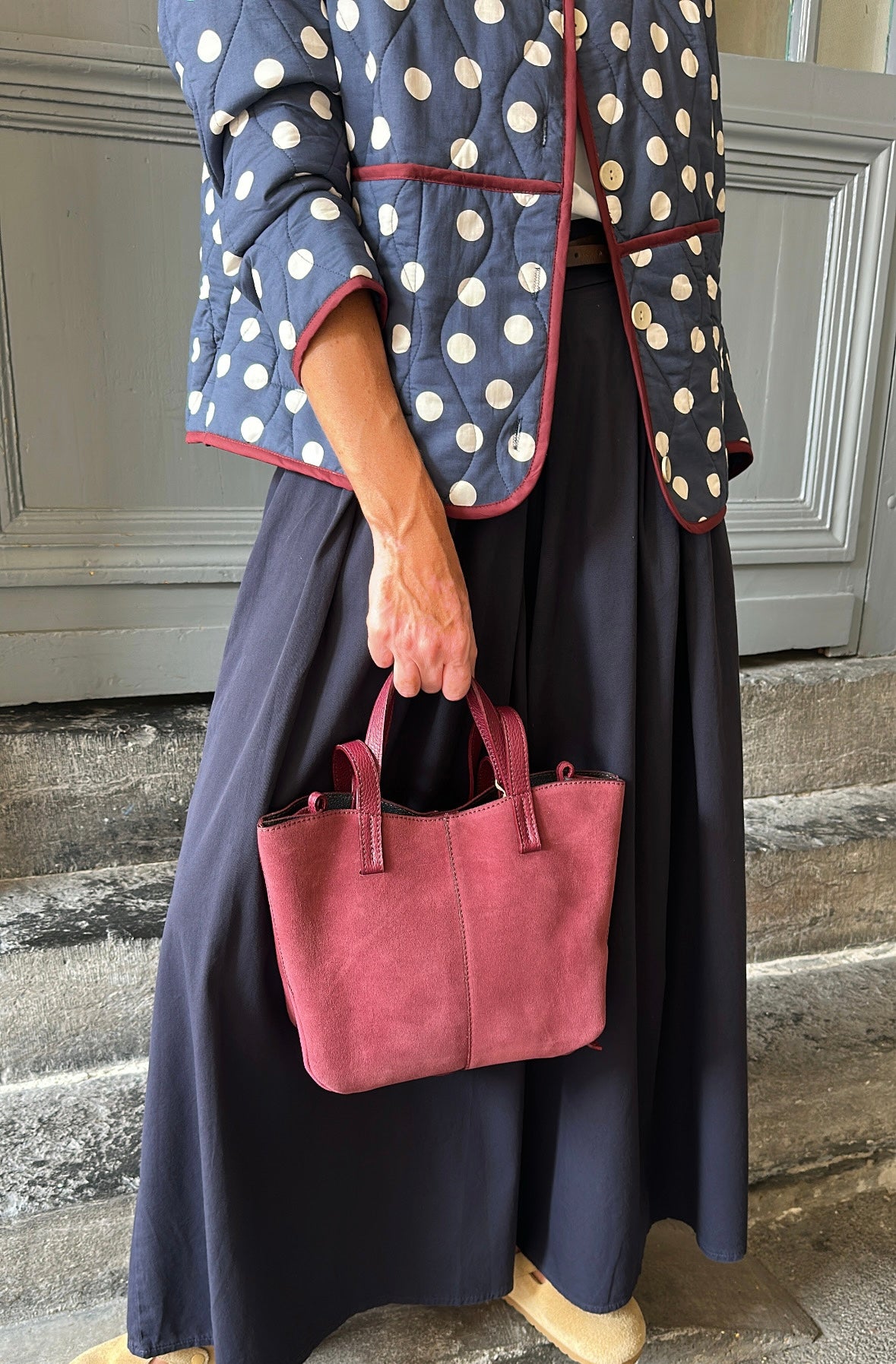 Sac en daim avec 2 longueurs de lanière. Fermeture bouton pression, pochette intérieure. Les côtés sont émantés de chaque côté pour lui donner une forme différente.