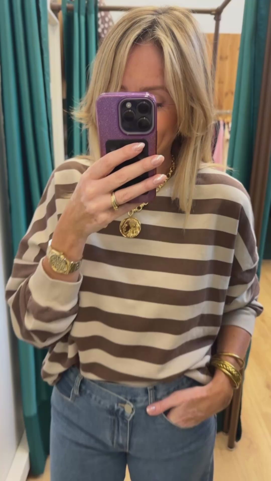 Sweat marron et beige rayé avec un effet vieilli. Coupe oversize.