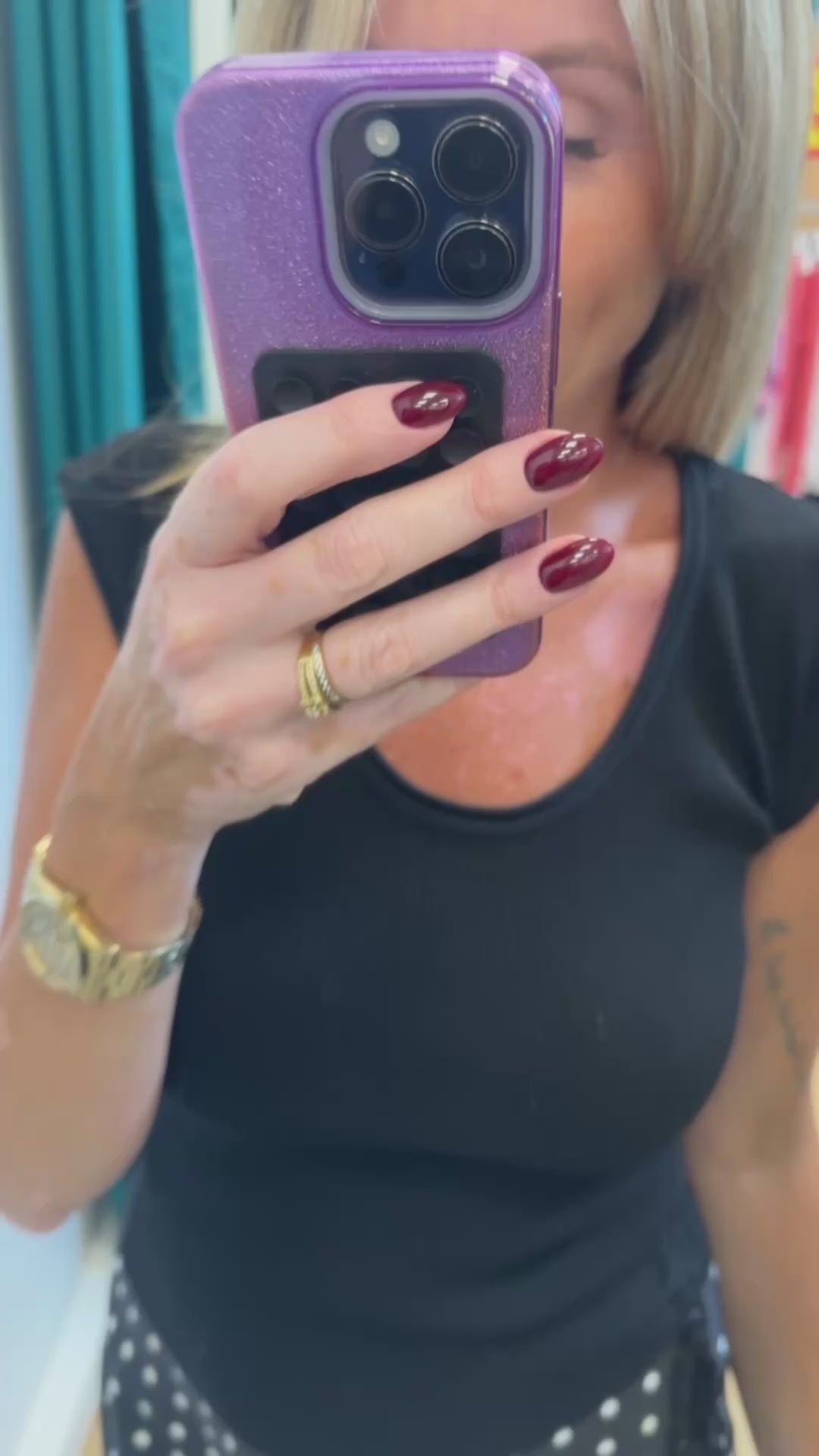 Top noir col rond plongeant, avec un lien sur le côté pour le froncer.
