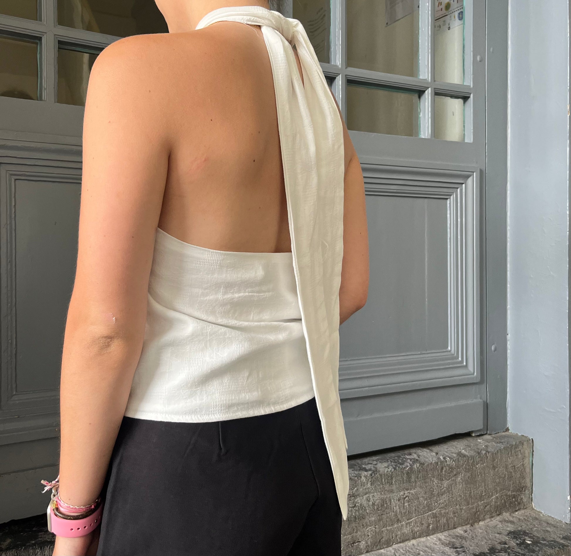 Top à nouer dans le cou, 80% viscose et 20% polyamide.