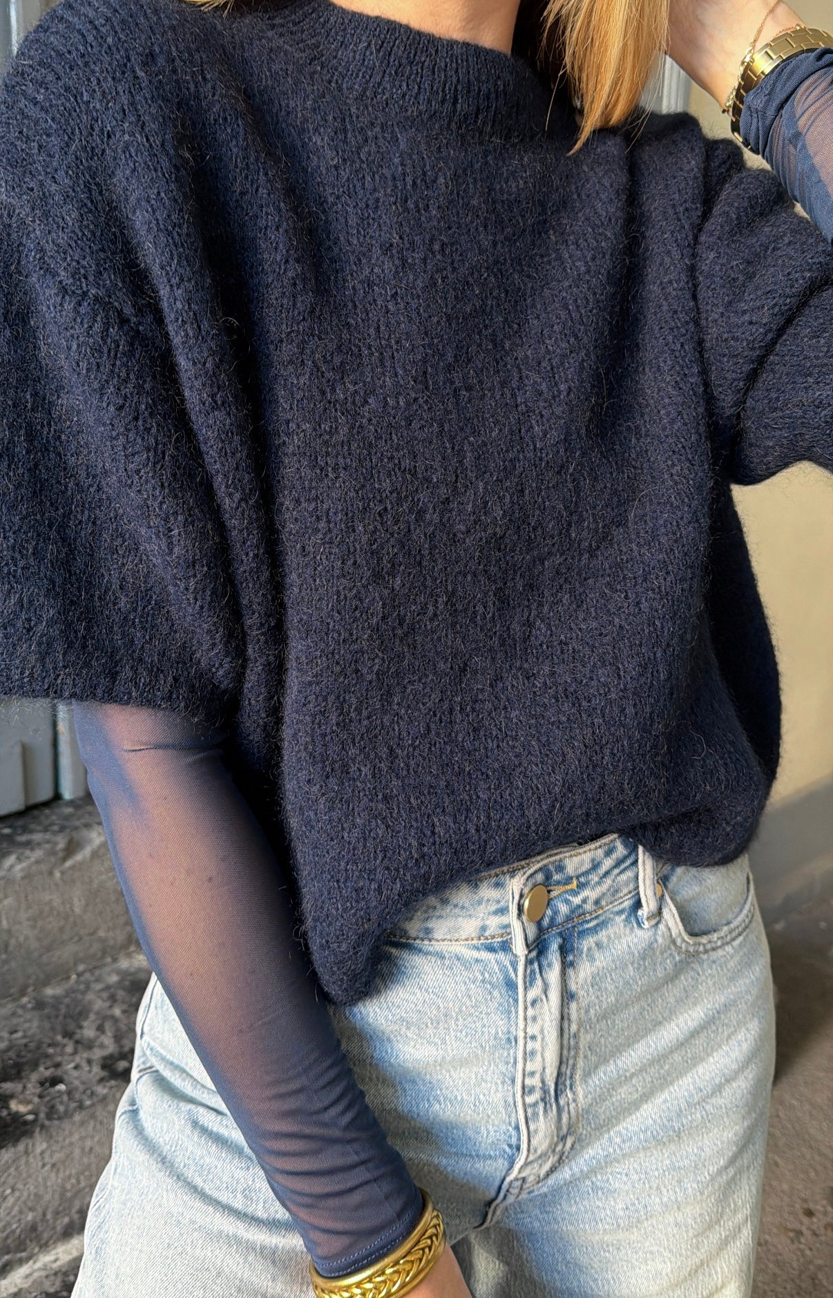 Top à longues manches transparent bleu marine. Col rond.