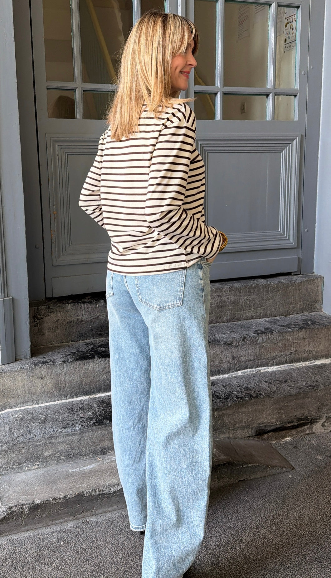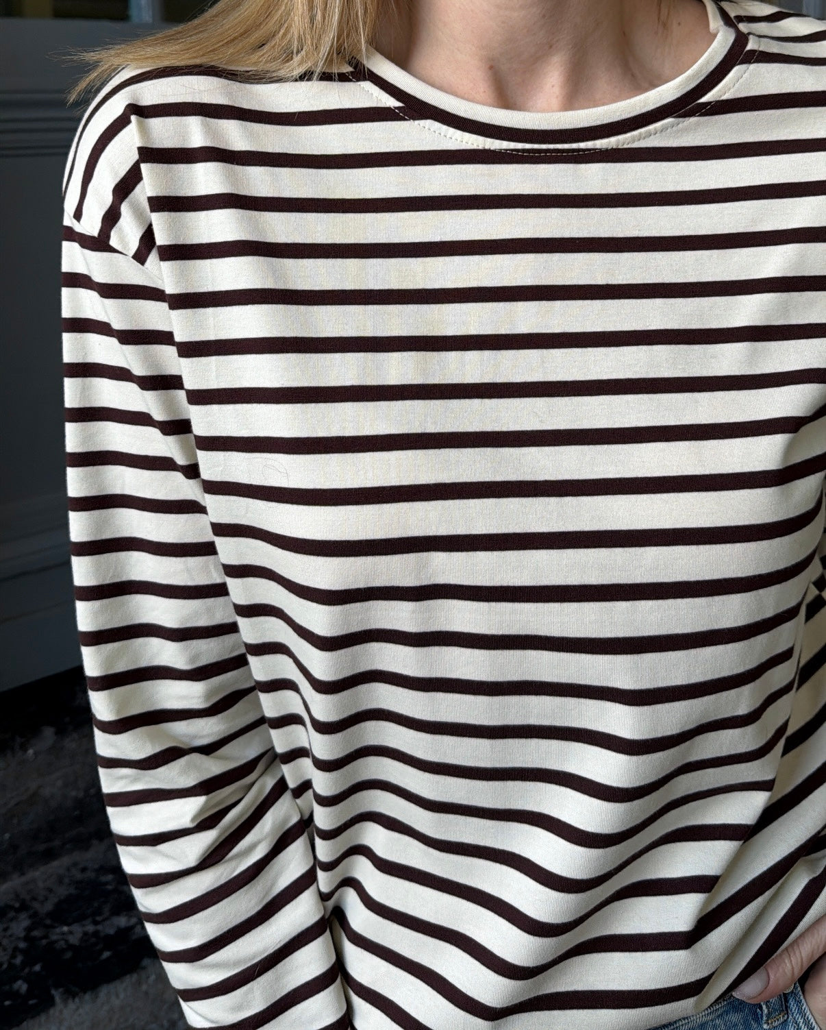 Top rayé écru et chocolat à manche longue.