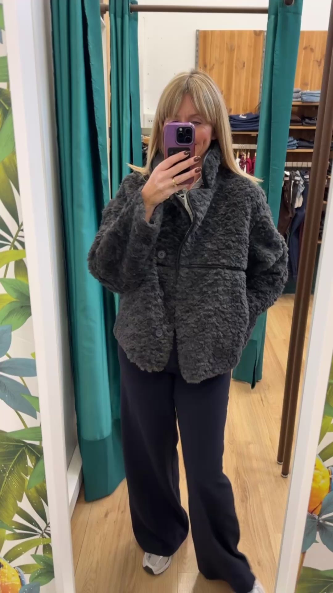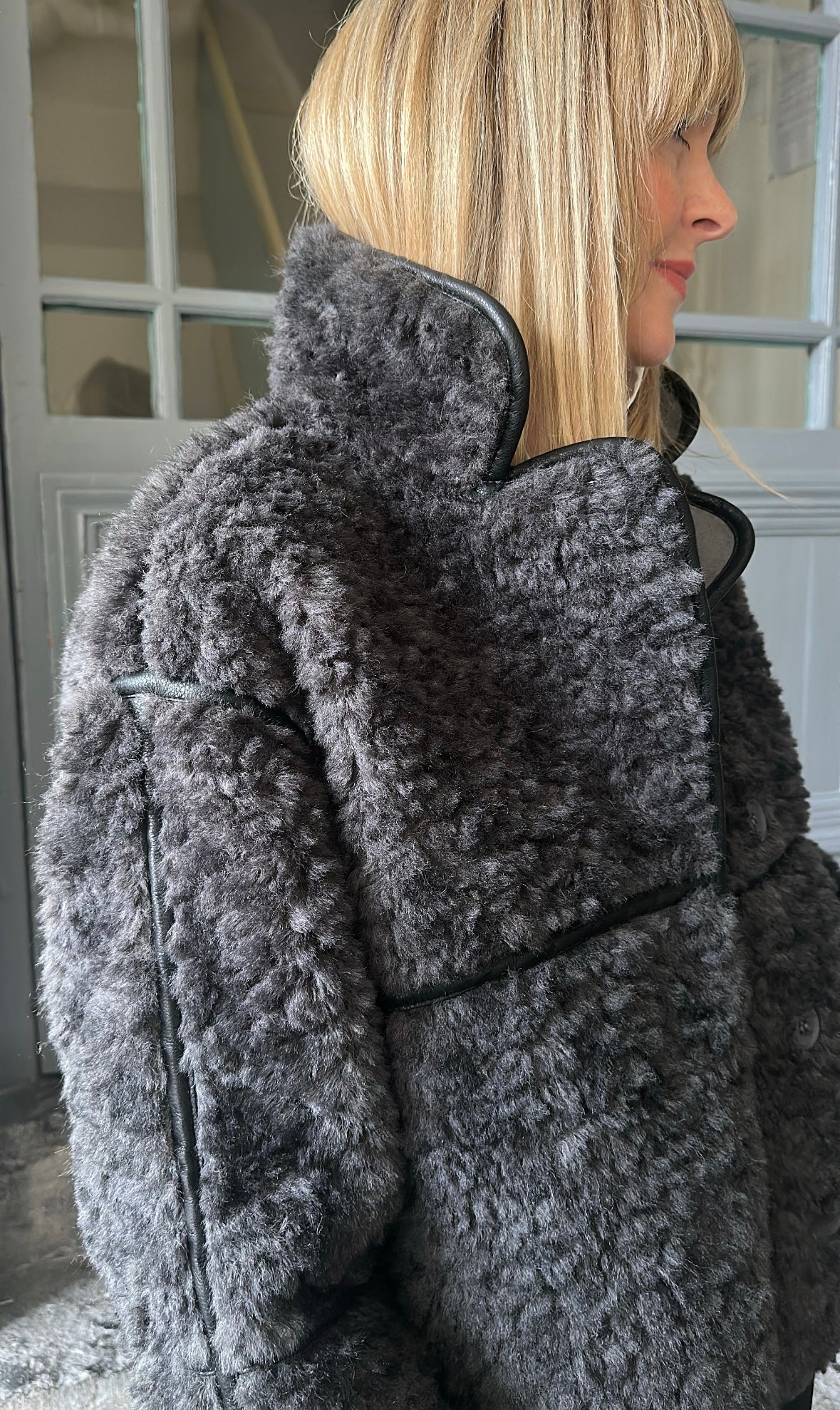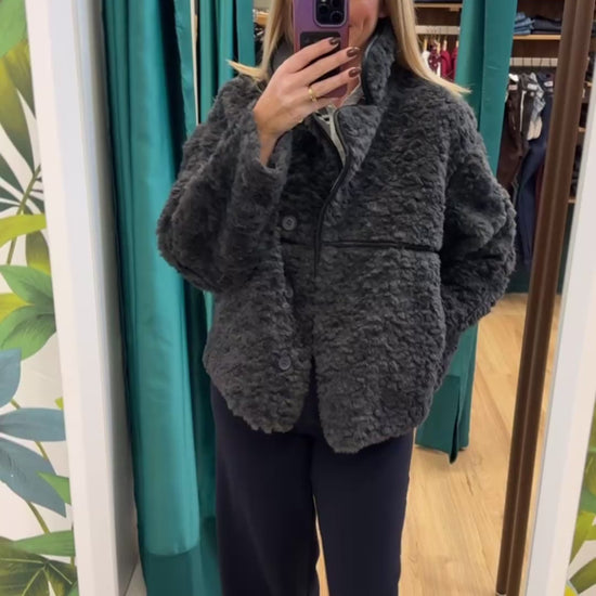 Veste grise en tissu Teddy bear doux avec détails en tissu enduit. Coupe flottante avec col à revers cranté, poches couture et boutonnage devant. Emmanchures descendues et manches longues.