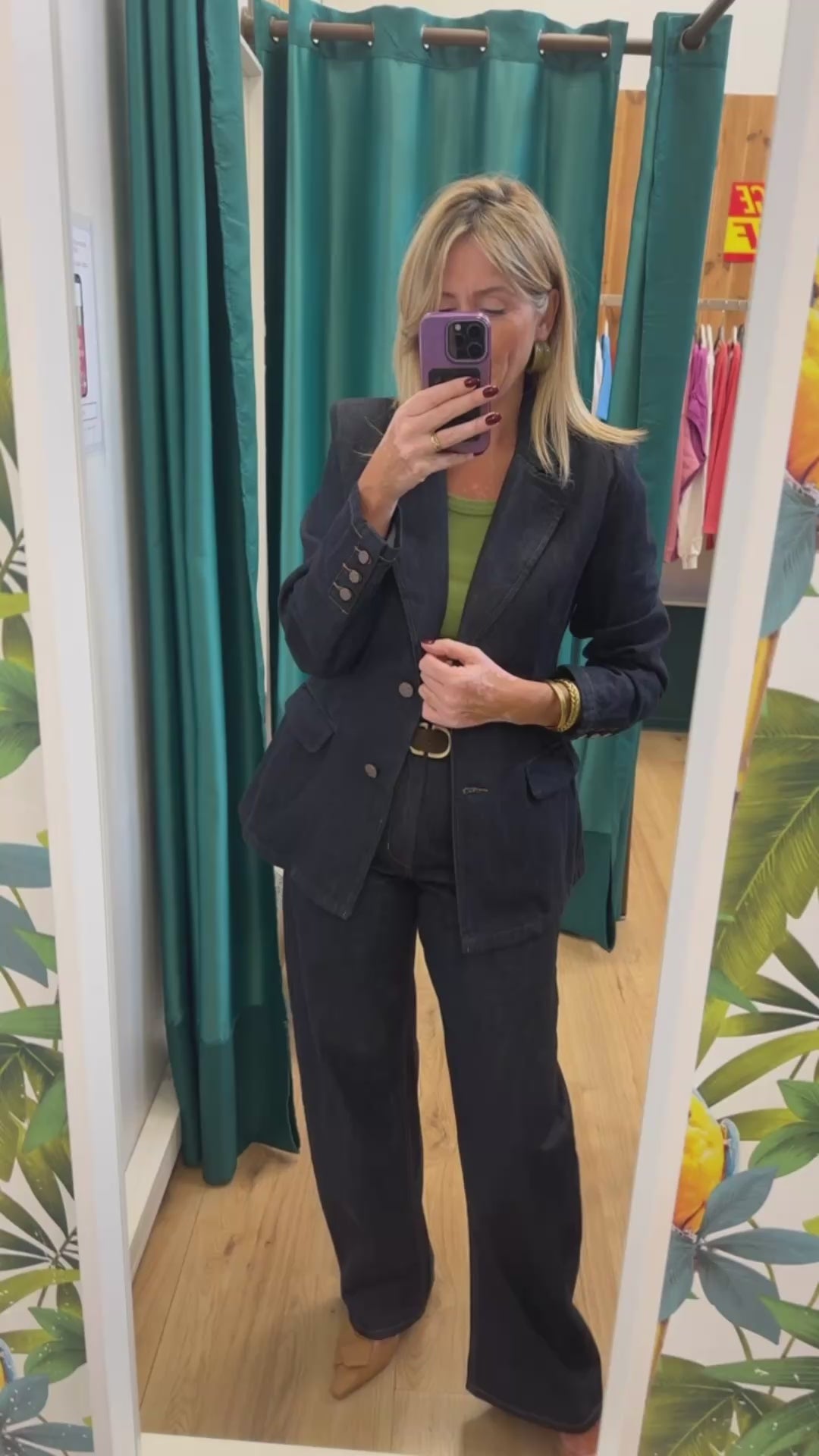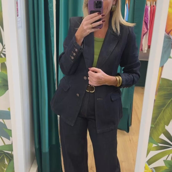 Veste en jean brut coupe blazer, très cintrée à la taille. Épaulettes.