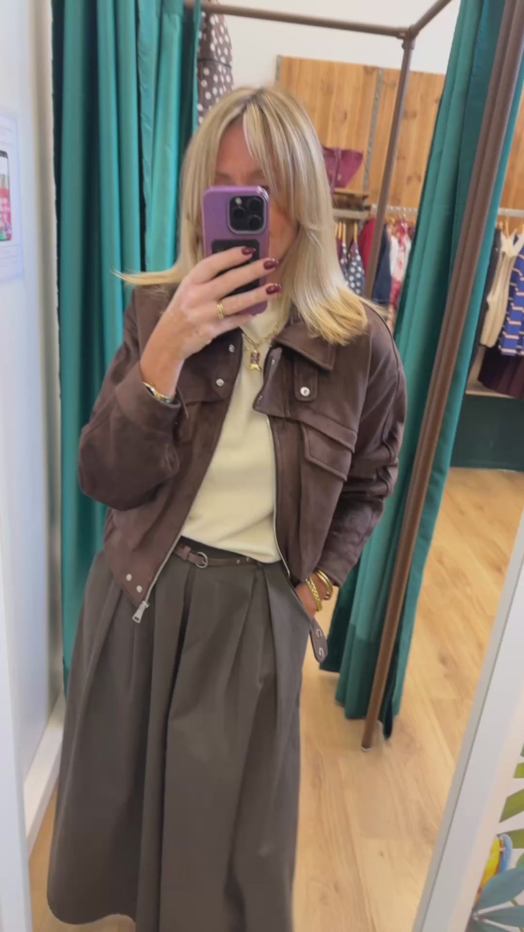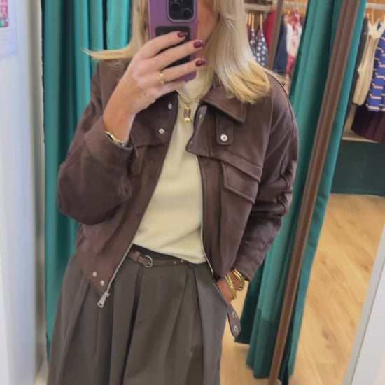 Veste en suédine chocolat, style bomber avec un col. Coupe ajustée.